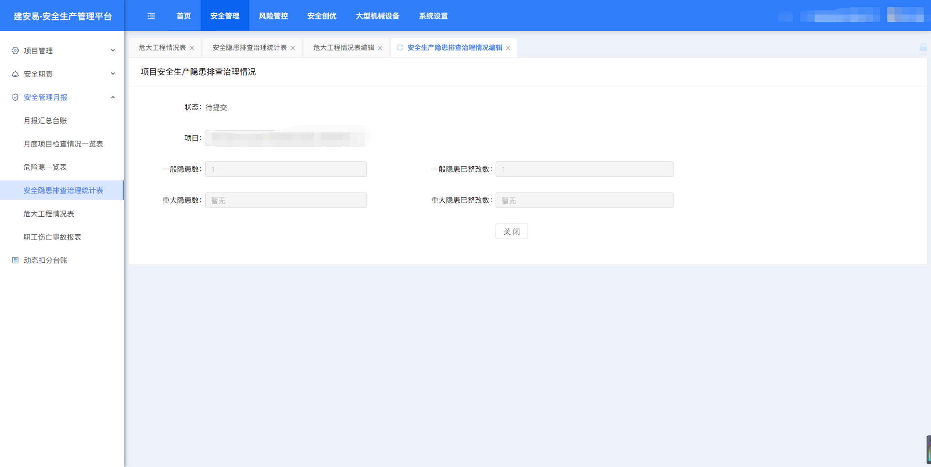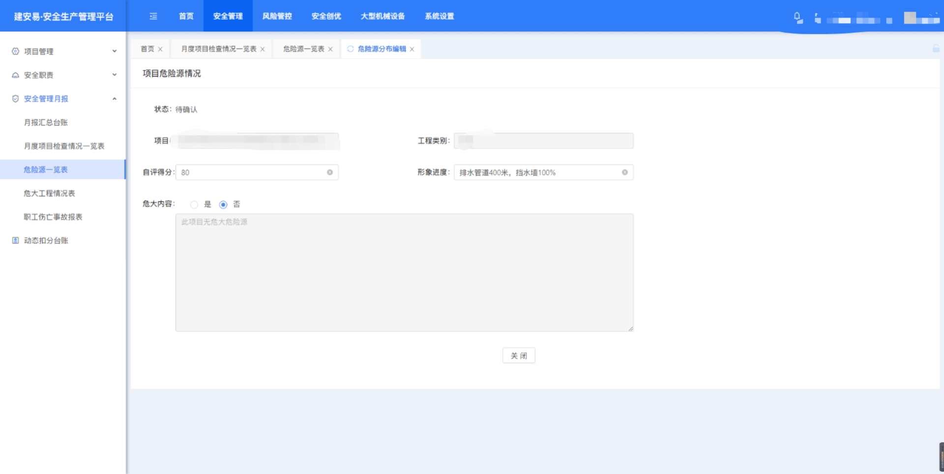 实时数据,每个月对应做过项目自检的检查信息,只显示最新的一条,如果项目做过对应的危险源填报,这里的月巡检次数和自评得分对应那边的数据。