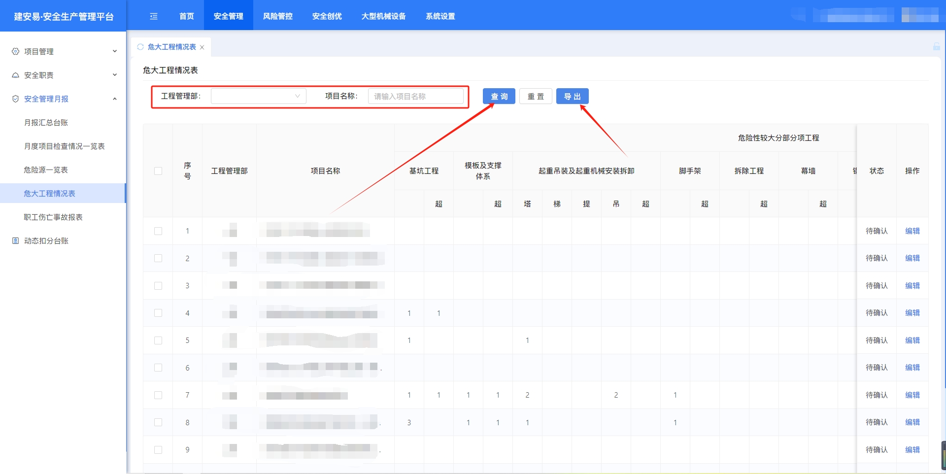 点击“安全管理月报”-“危大工程情况表”,筛选分公司、项目名称“查询”,点击“导出”可以下载筛选结果的excel表格。
