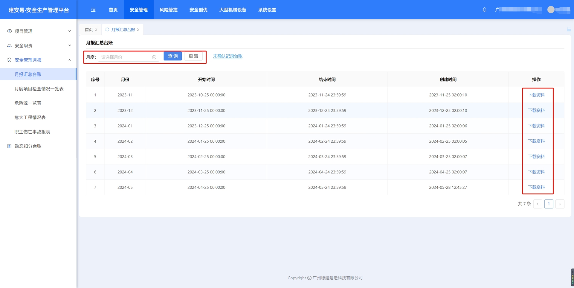 打开“安全管理月报”-“月报汇总台账”,筛选月份,“下载资料”