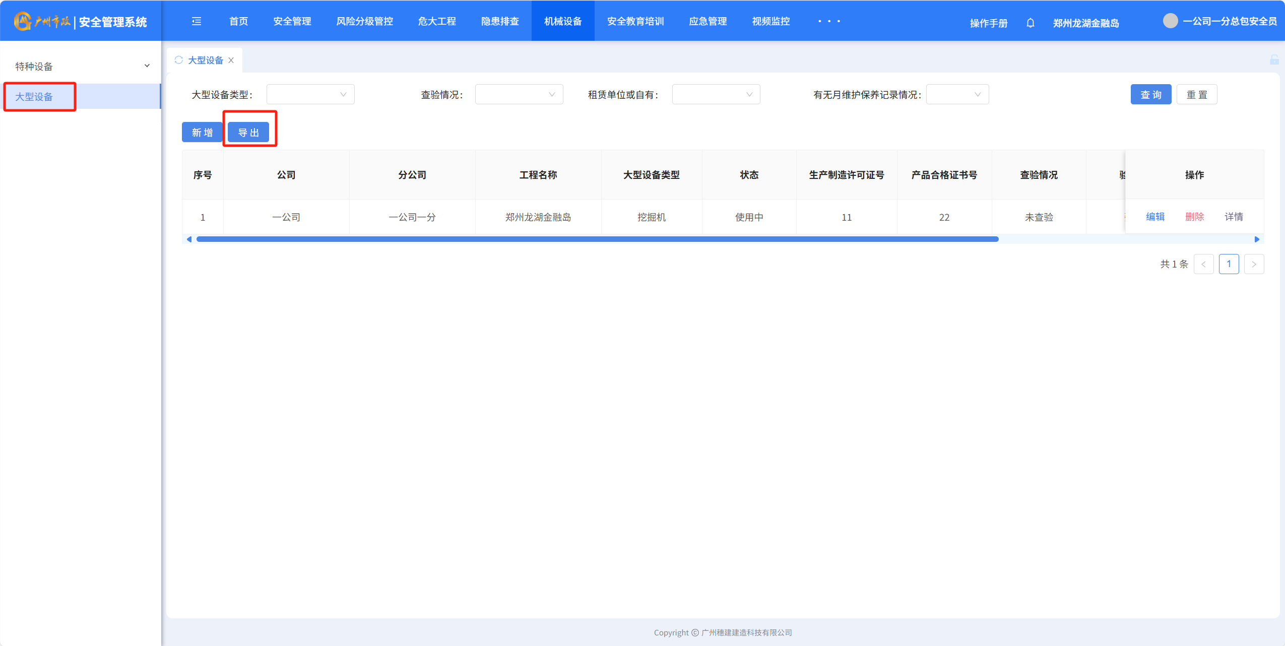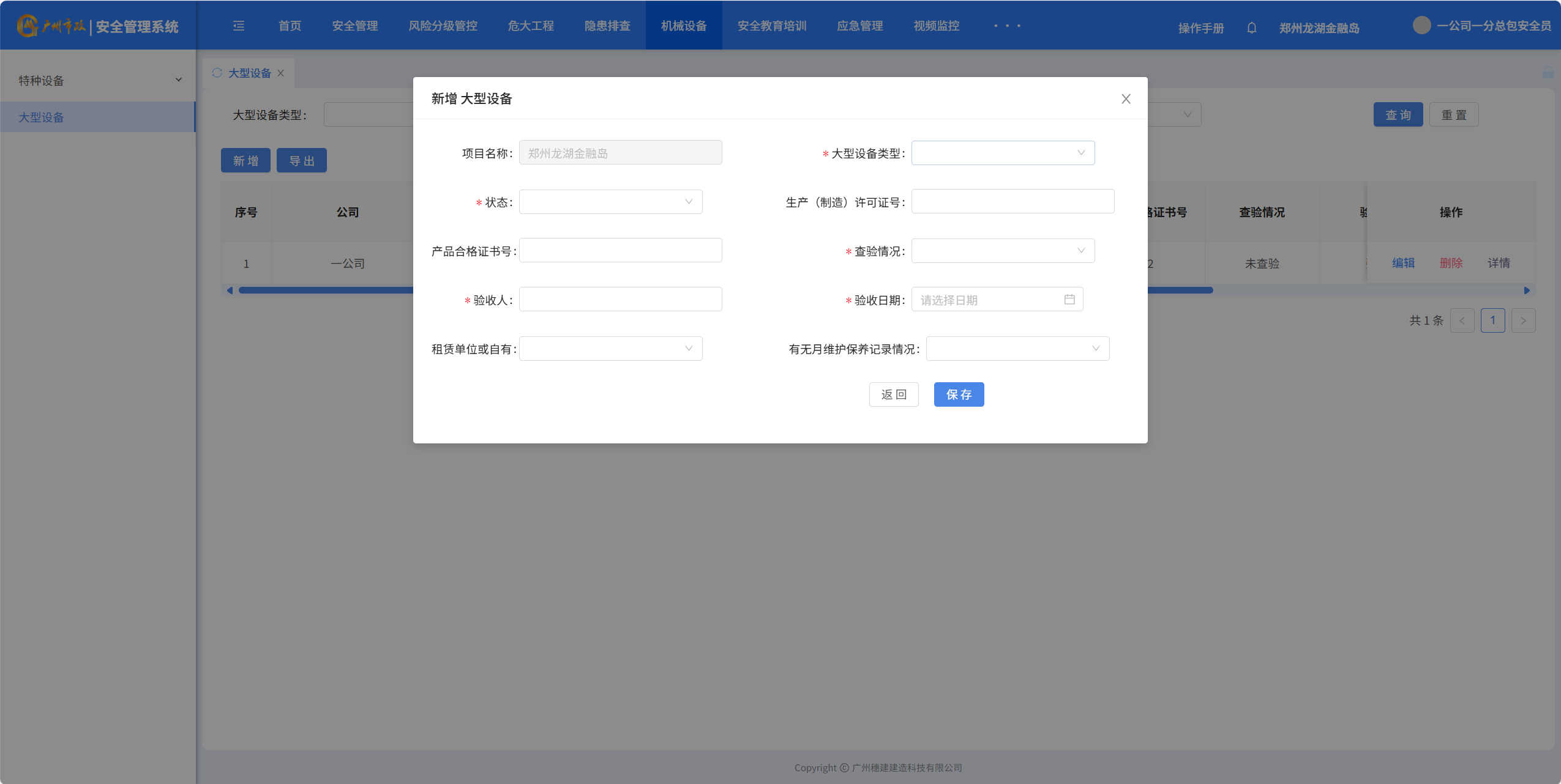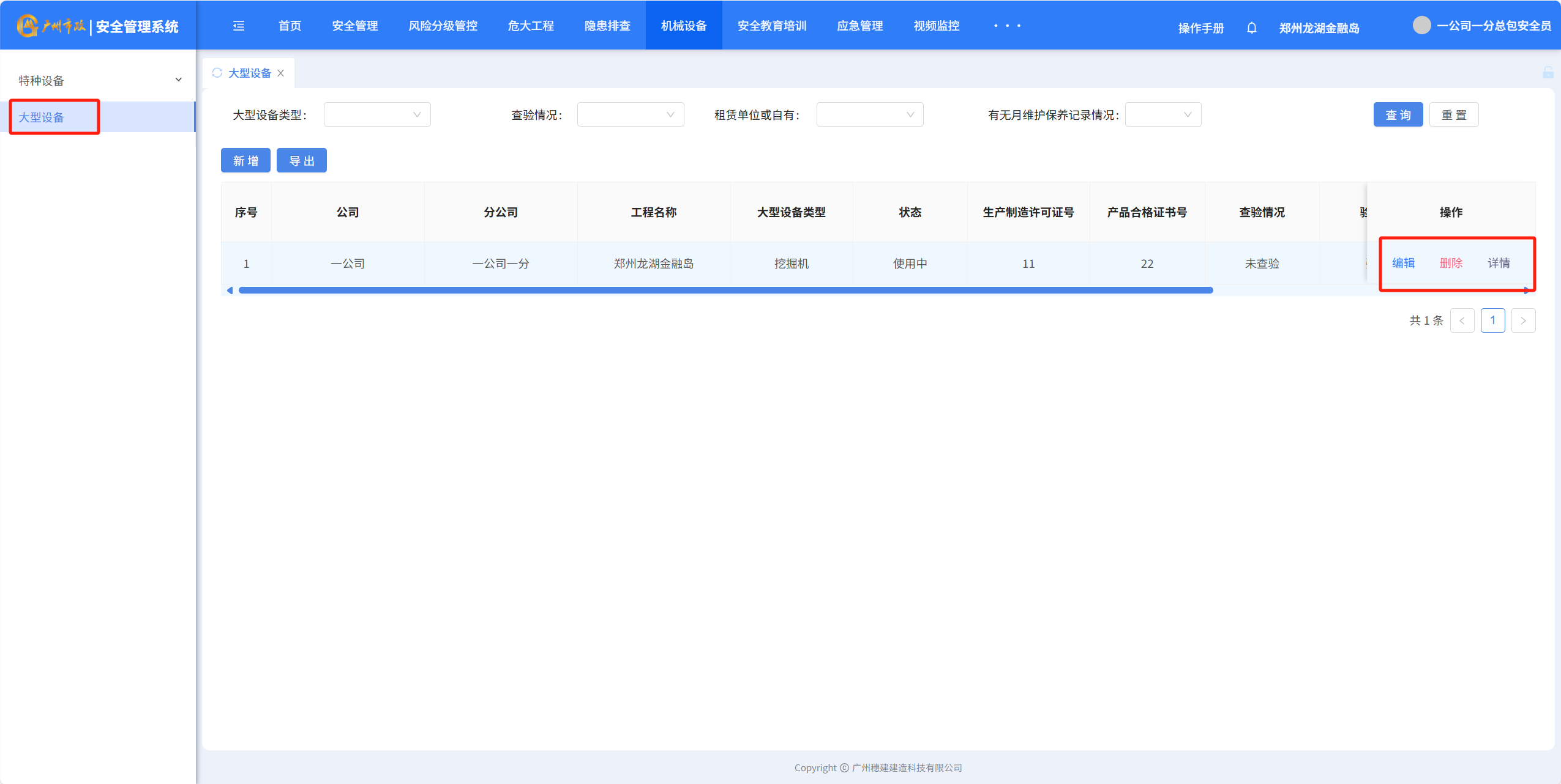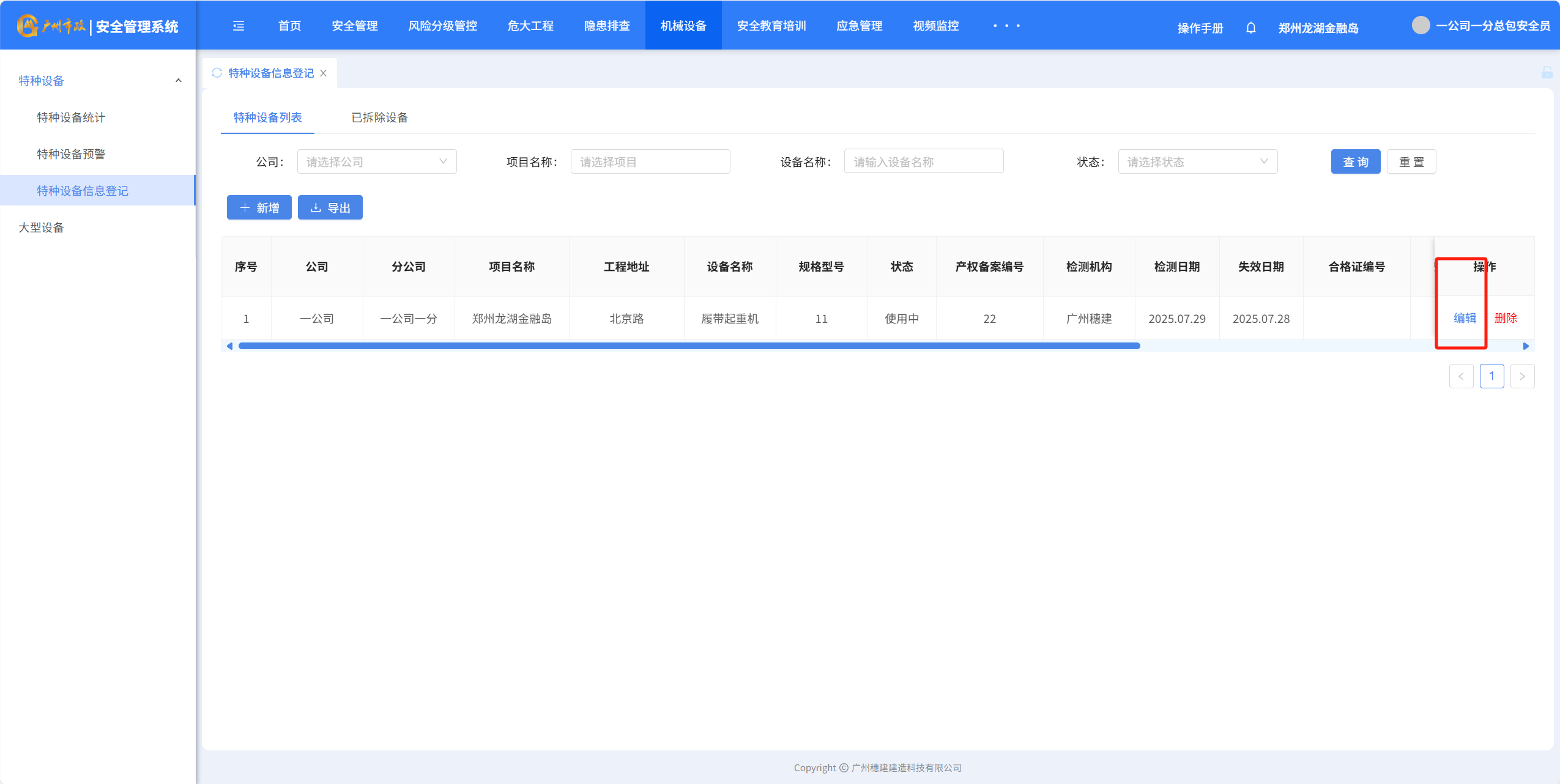 目录 搜索 展开 一、账号开通与登录二、首页三、安全检查(含小程序操作流程)1.集团对项目检查2.集团领导带班检查3.公司对项目检查(公司、分公司)4.公司领导带班检查(公司、分公司)5.集团下发停工通知书6.公司、分公司下发停工通知书7.下发处罚通知书8.项目自查9.远程视频检查10.web端安全隐患排查模块说明四、安全验收操作说明(小程序操作流程)五、安全标准化六、项目安全风险分级管控七、动态扣分八、安全责任九、项目管理十、安全管理月报十一、安全创优十二、机械设备十三、标准化考评十四、大屏十五、风险分级管控十六、危大工程十七、预警十八、安全教育培训十九、应急管理二十、知识库二十一、视频监控二十二、系统设置二十三、劳务管理(项目设置、工人进退场)1.劳务项目初始化设置2.工人入场流程3.工人退场流程4.资料库5.操作线下完成三级教育二十四、物业检查(含小程序操作流程)1.集团对项目检查2.集团领导带班检查3.公司对项目检查4.公司领导带班检查 暂无相关搜索结果! 阅读次数:466 本文档使用 MinDoc 发布 十二、机械设备 十二、机械设备1.特种设备统计 2.特种设备预警点击“设备台账”-“预警设备汇总列表”查询证件快到期的设备,筛选“查询”项目设备信息 3.设备信息登记点击“新增”填写设备信息点击“确定”完成添加设备点击“编辑”可以编辑设备详细信息点击”导出可以导出特种设备信息” 4.大型设备登记点击“新增”填写大型设备信息支持“编辑、删除、查看详情”设备详细信息点击”导出可以导出特种设备信息”作者:穗建科技 创建时间:2024-06-05 14:58最后编辑:穗建科技 更新时间:2026-03-09 10:32