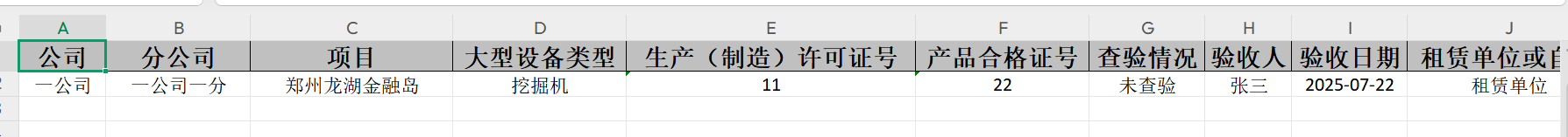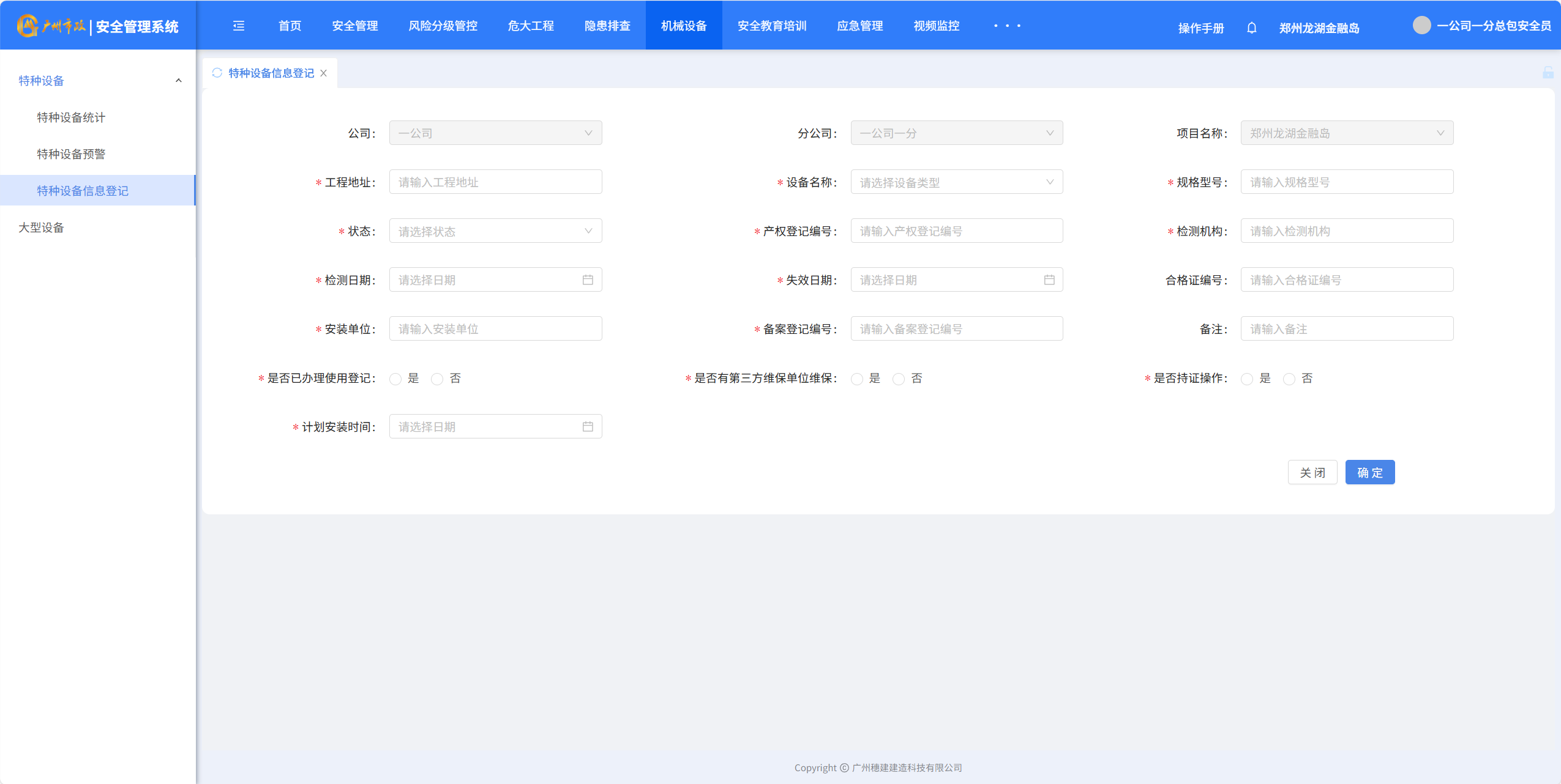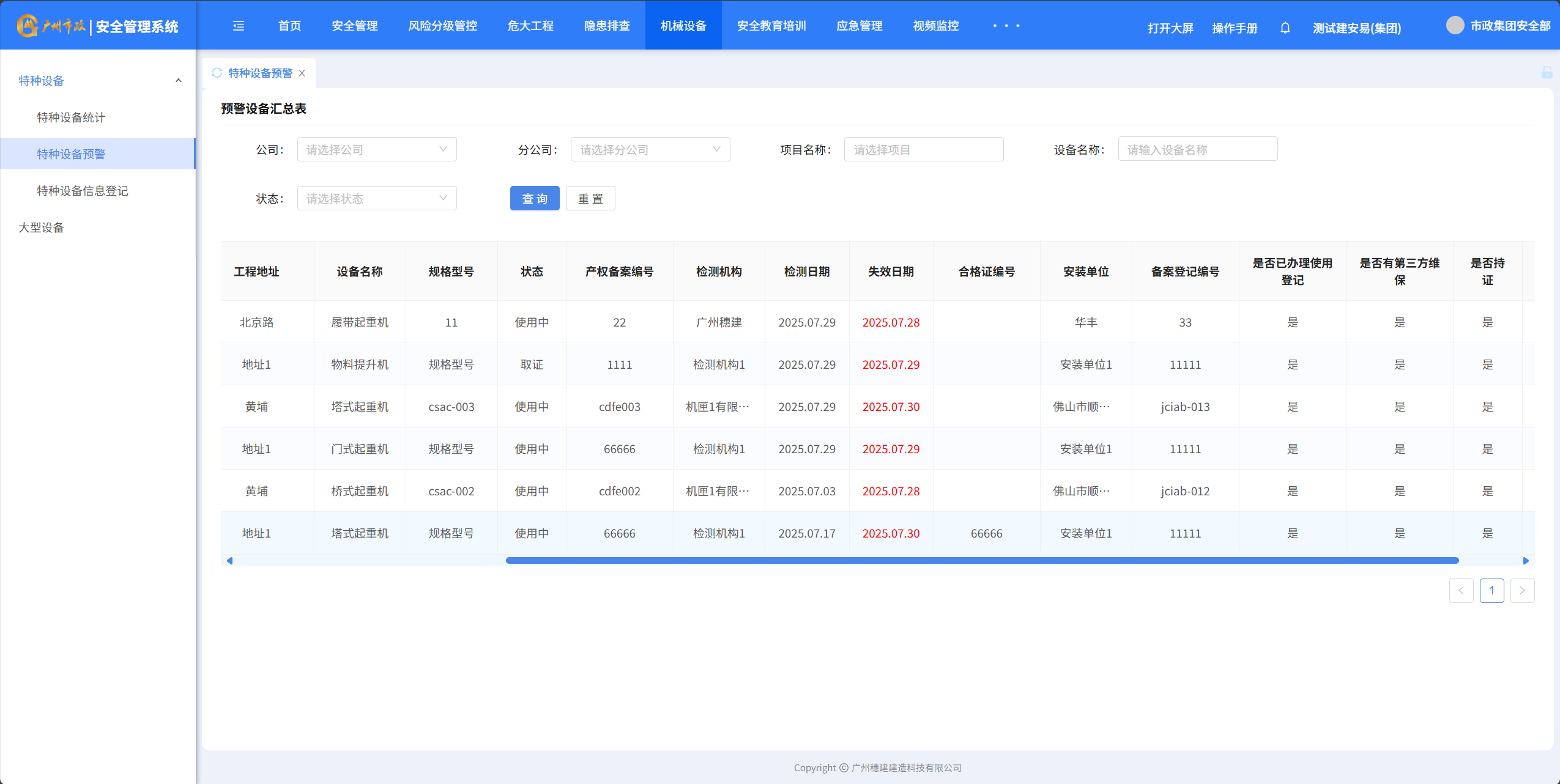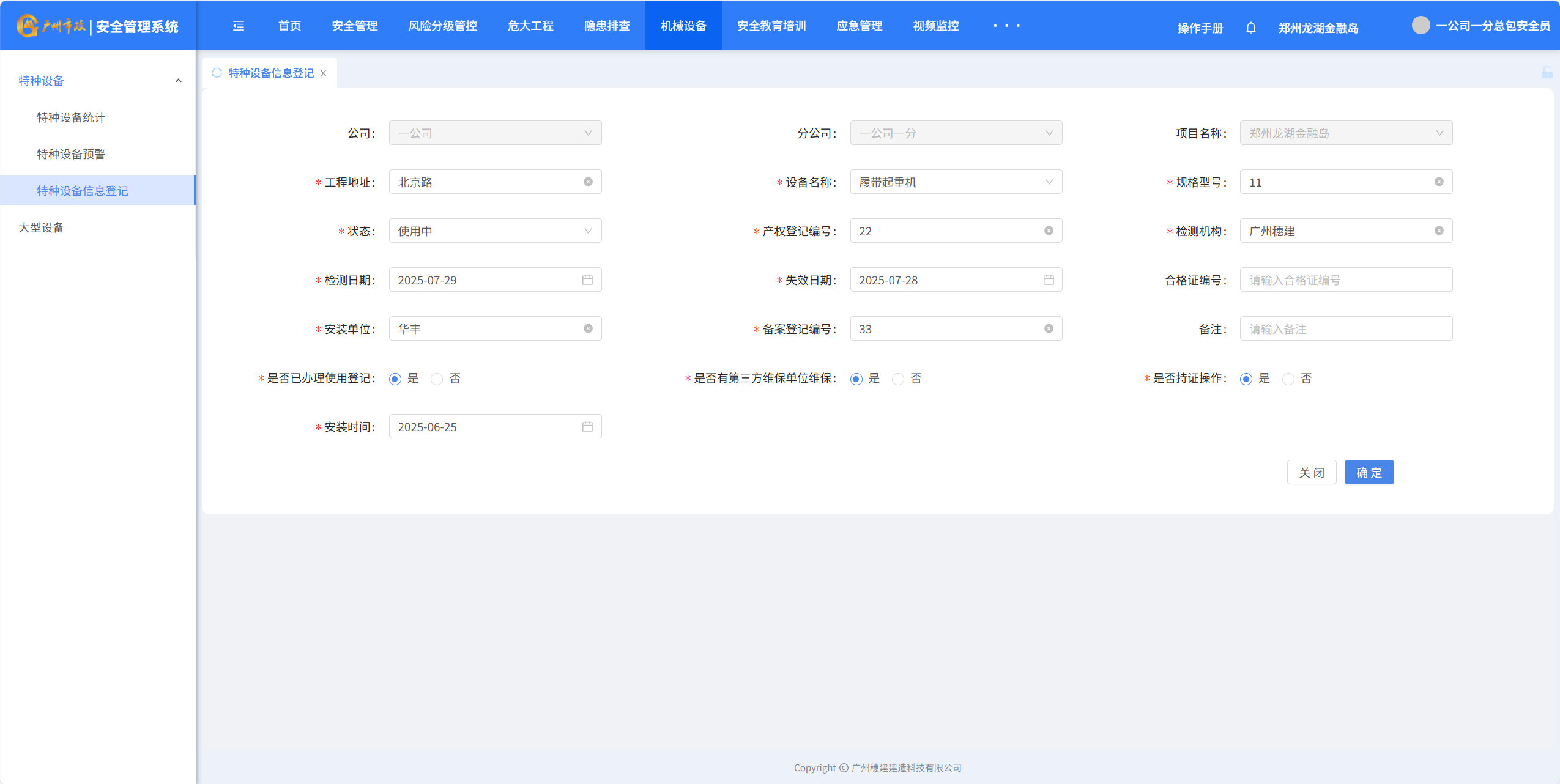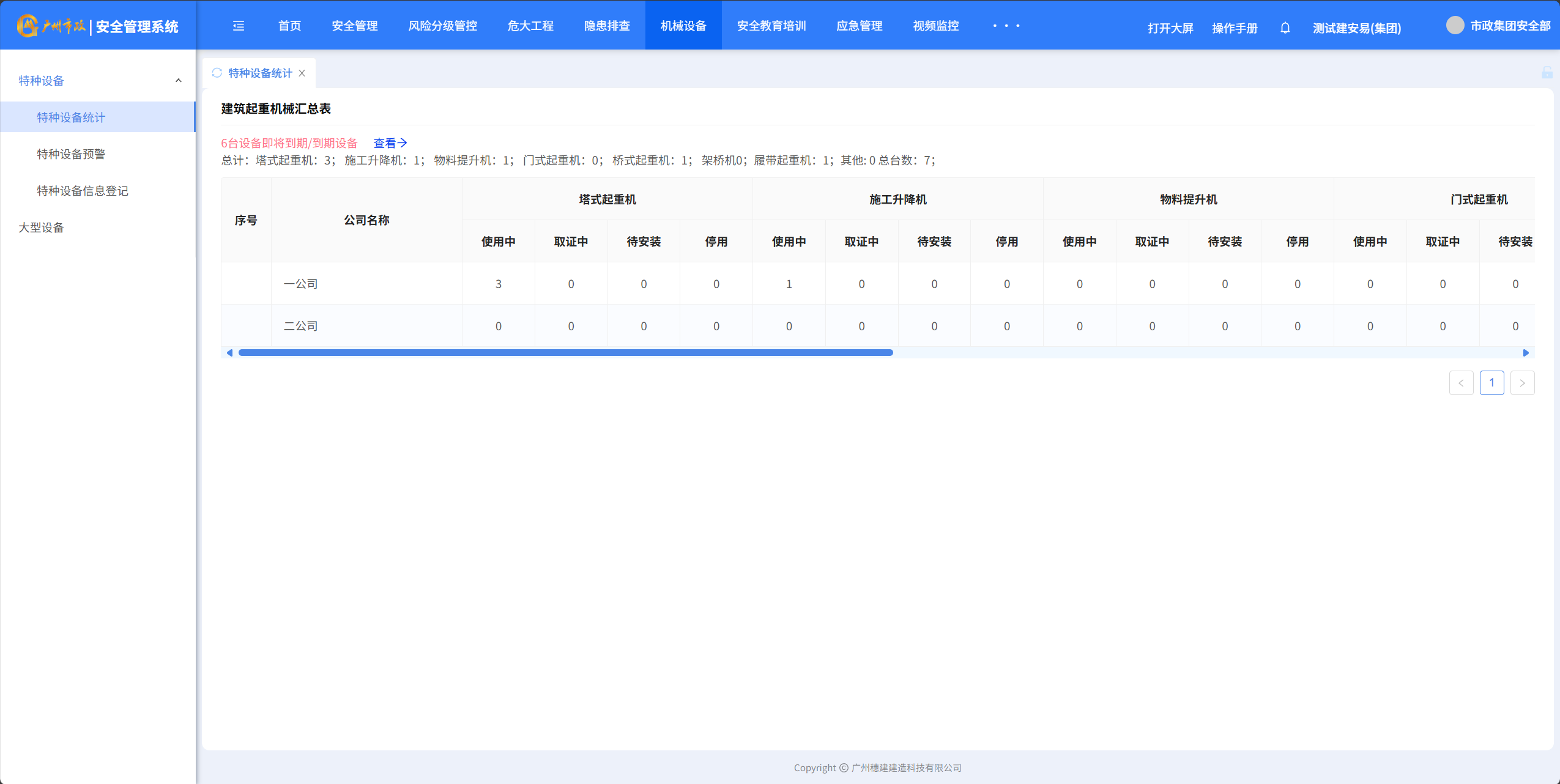 目录 搜索 展开 一、账号开通与登录二、首页三、安全检查(含小程序操作流程)1.集团对项目检查2.集团领导带班检查3.公司对项目检查(公司、分公司)4.公司领导带班检查(公司、分公司)5.集团下发停工通知书6.公司、分公司下发停工通知书7.下发处罚通知书8.项目自查9.远程视频检查10.web端安全隐患排查模块说明四、安全验收操作说明(小程序操作流程)五、安全标准化六、项目安全风险分级管控七、动态扣分八、安全责任九、项目管理十、安全管理月报十一、安全创优十二、机械设备十三、标准化考评十四、大屏十五、风险分级管控十六、危大工程十七、预警十八、安全教育培训十九、应急管理二十、知识库二十一、视频监控二十二、系统设置二十三、劳务管理(项目设置、工人进退场)1.劳务项目初始化设置2.工人入场流程3.工人退场流程4.资料库5.操作线下完成三级教育二十四、物业检查(含小程序操作流程)1.集团对项目检查2.集团领导带班检查3.公司对项目检查4.公司领导带班检查 暂无相关搜索结果! 阅读次数:466 本文档使用 MinDoc 发布 十二、机械设备 十二、机械设备1.特种设备统计 2.特种设备预警点击“设备台账”-“预警设备汇总列表”查询证件快到期的设备,筛选“查询”项目设备信息 3.设备信息登记点击“新增”填写设备信息点击“确定”完成添加设备点击“编辑”可以编辑设备详细信息点击”导出可以导出特种设备信息” 4.大型设备登记点击“新增”填写大型设备信息支持“编辑、删除、查看详情”设备详细信息点击”导出可以导出特种设备信息”作者:穗建科技 创建时间:2024-06-05 14:58最后编辑:穗建科技 更新时间:2026-03-09 10:32