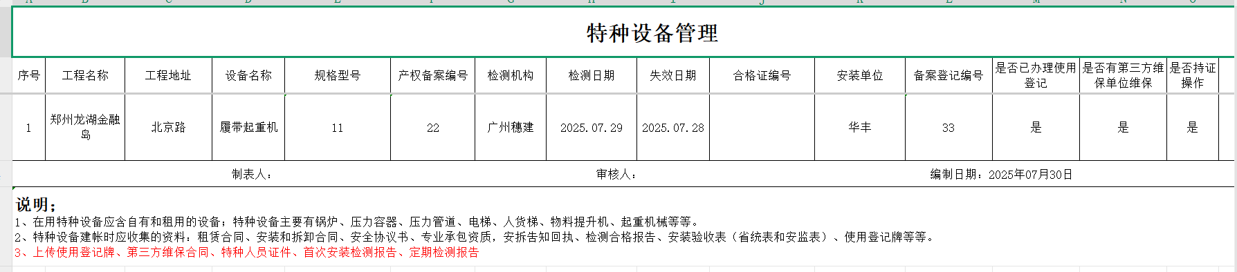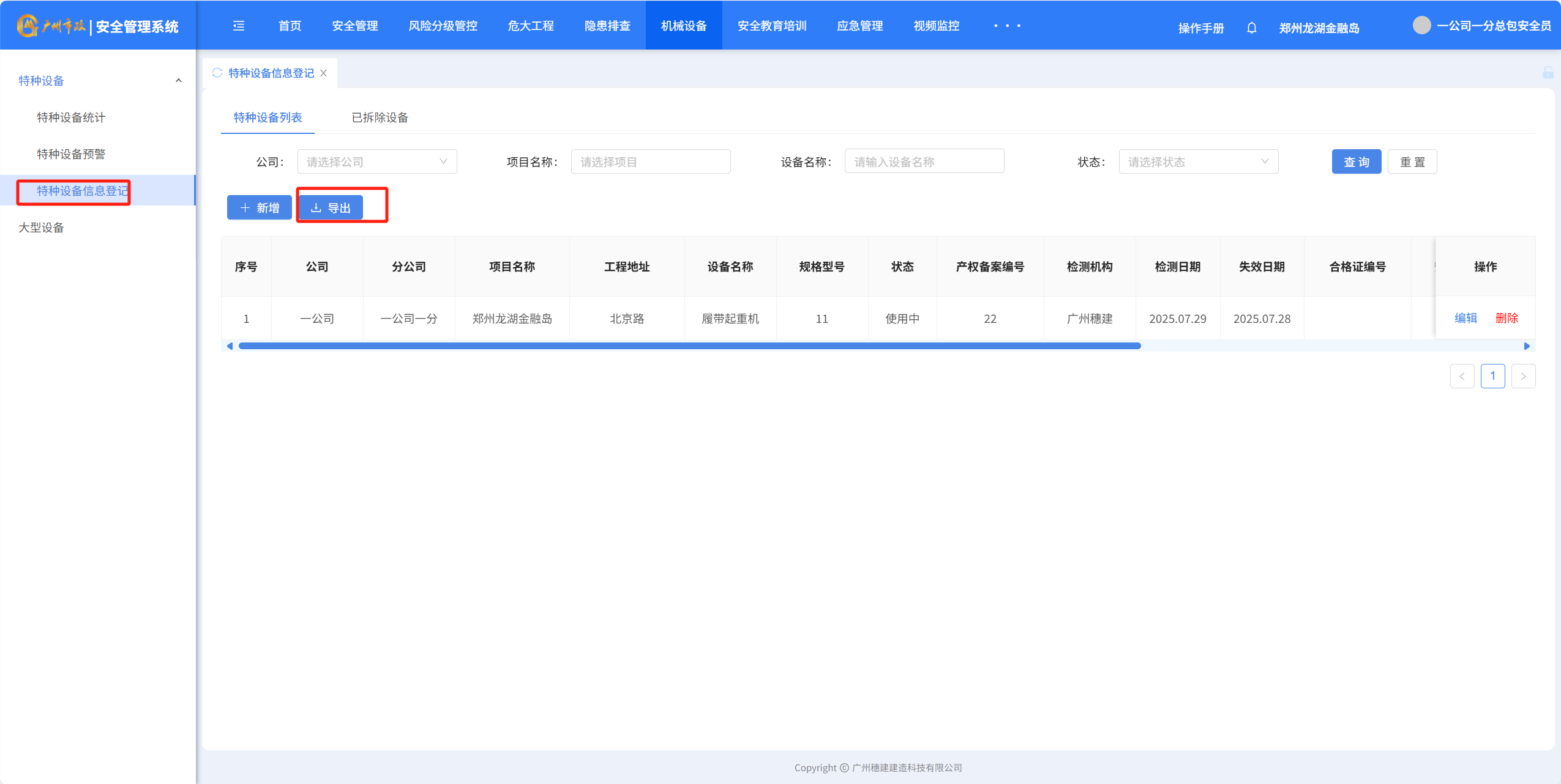 十二、机械设备1.特种设备统计 2.特种设备预警点击“设备台账”-“预警设备汇总列表”查询证件快到期的设备,筛选“查询”项目设备信息 3.设备信息登记点击“新增”填写设备信息点击“确定”完成添加设备点击“编辑”可以编辑设备详细信息点击”导出可以导出特种设备信息” 4.大型设备登记点击“新增”填写大型设备信息支持“编辑、删除、查看详情”设备详细信息点击”导出可以导出特种设备信息”作者:穗建科技 创建时间:2024-06-05 14:58最后编辑:穗建科技 更新时间:2026-03-09 10:32