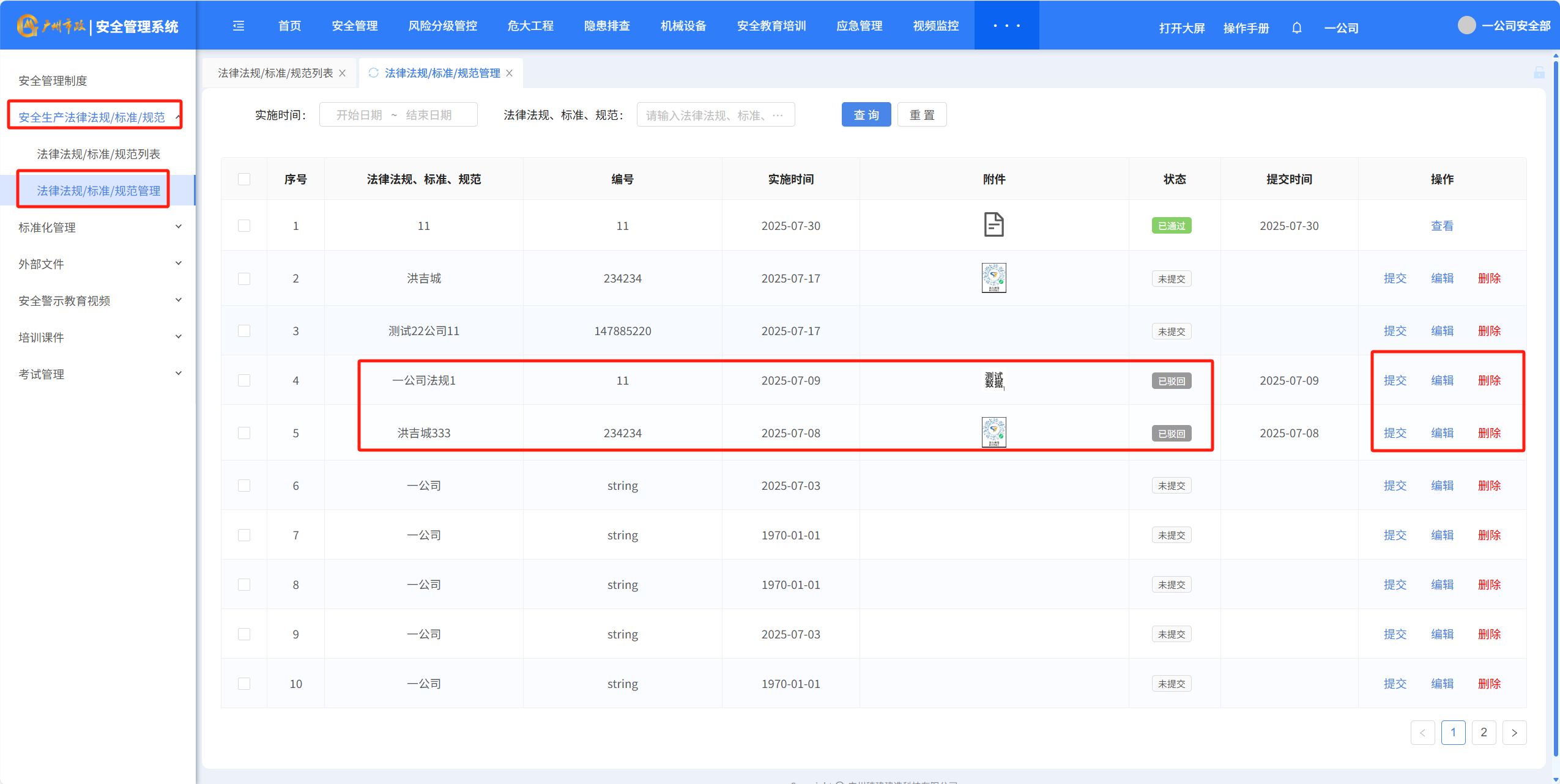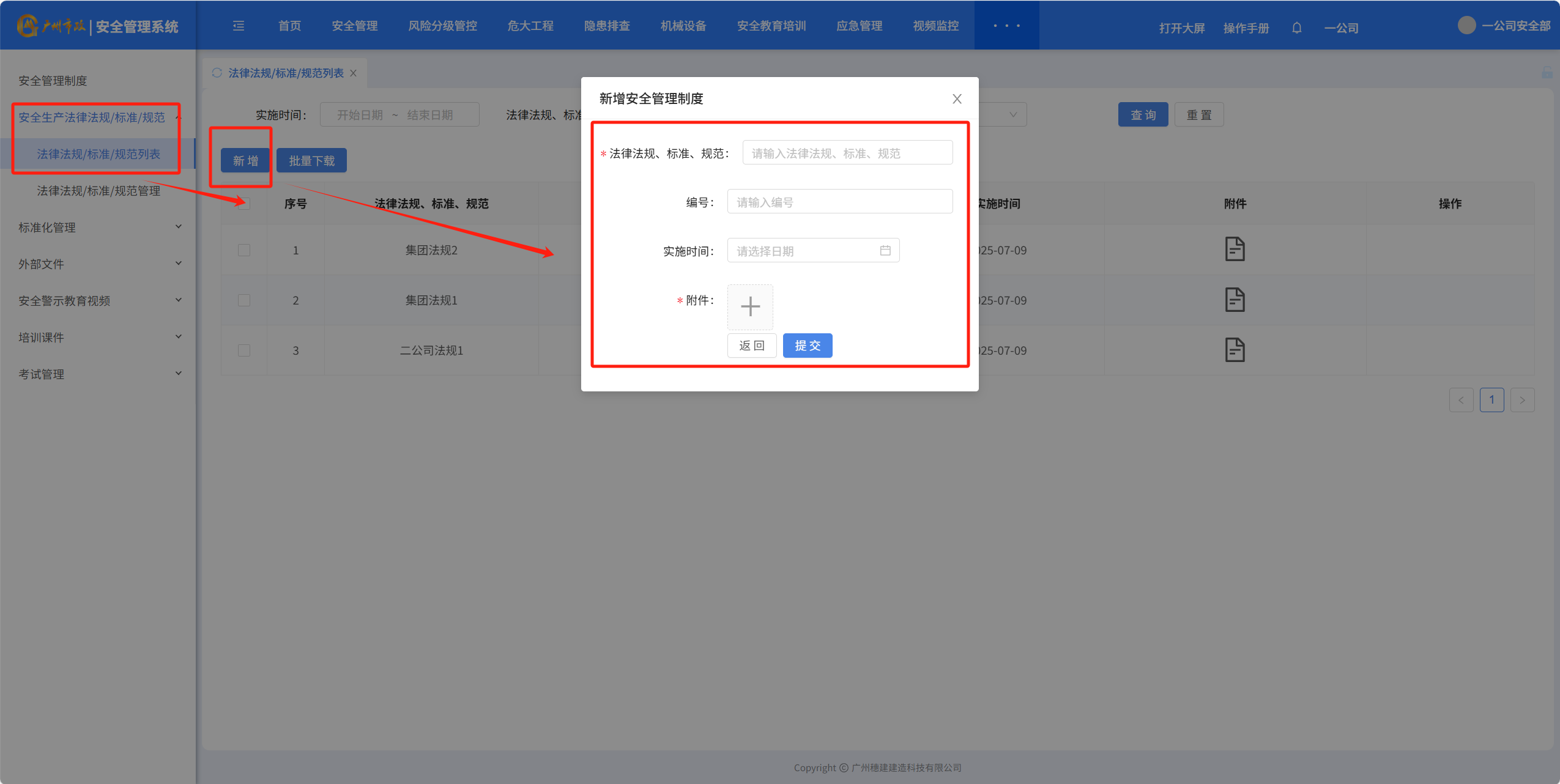 2.公司侧–点击新增按钮,输入法律法规、标准、规范、编号、实施时间、附件;点击保存