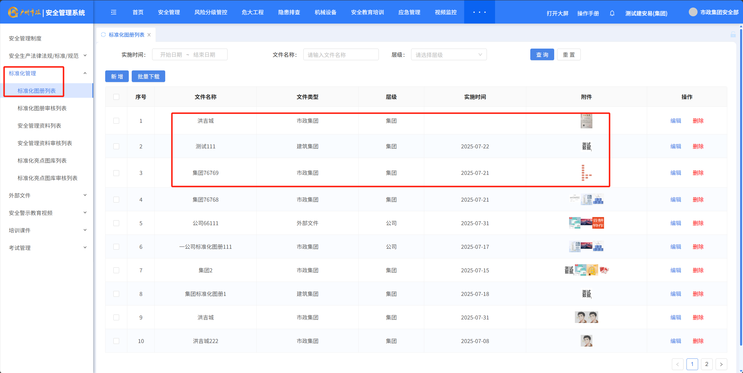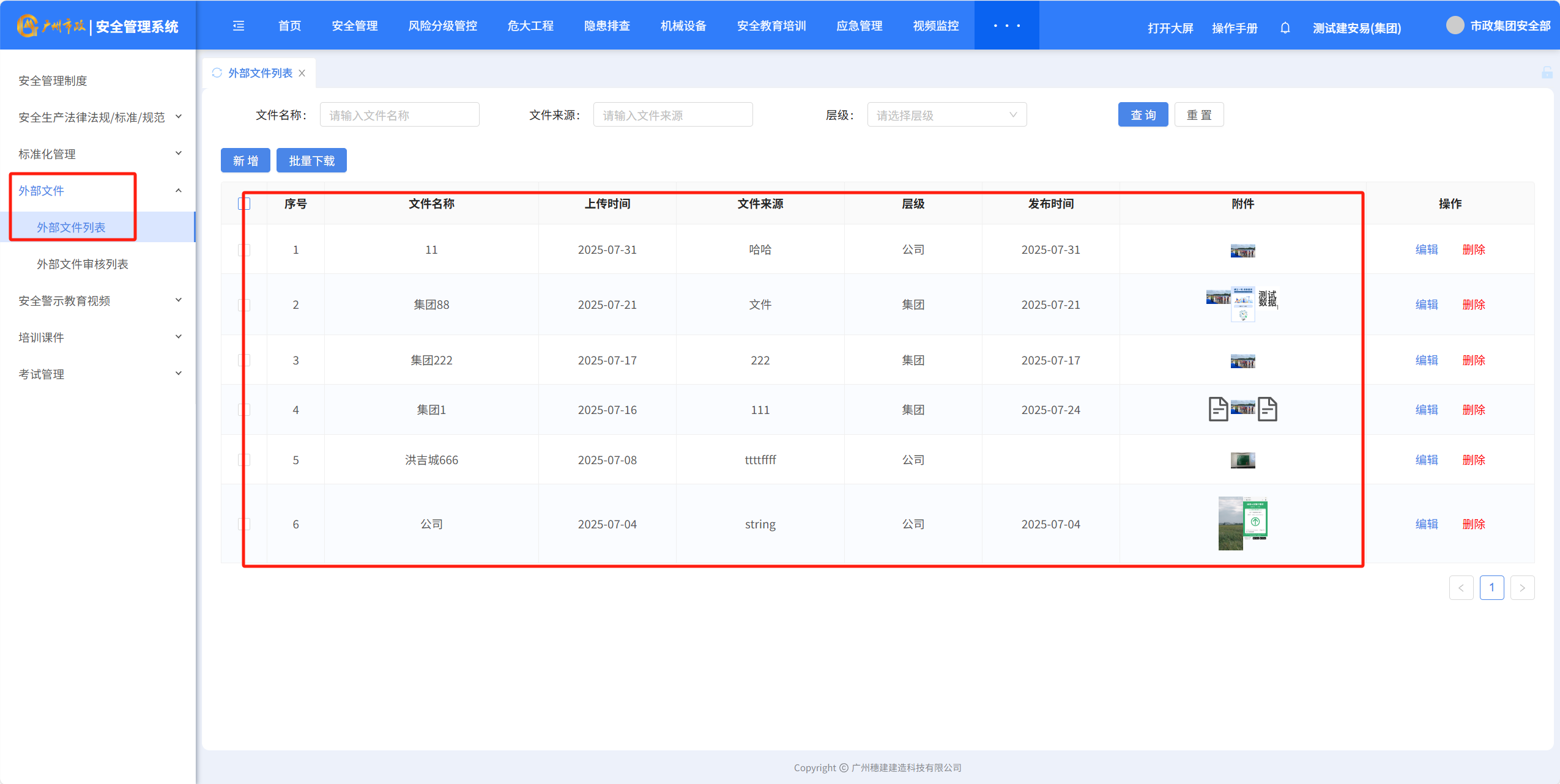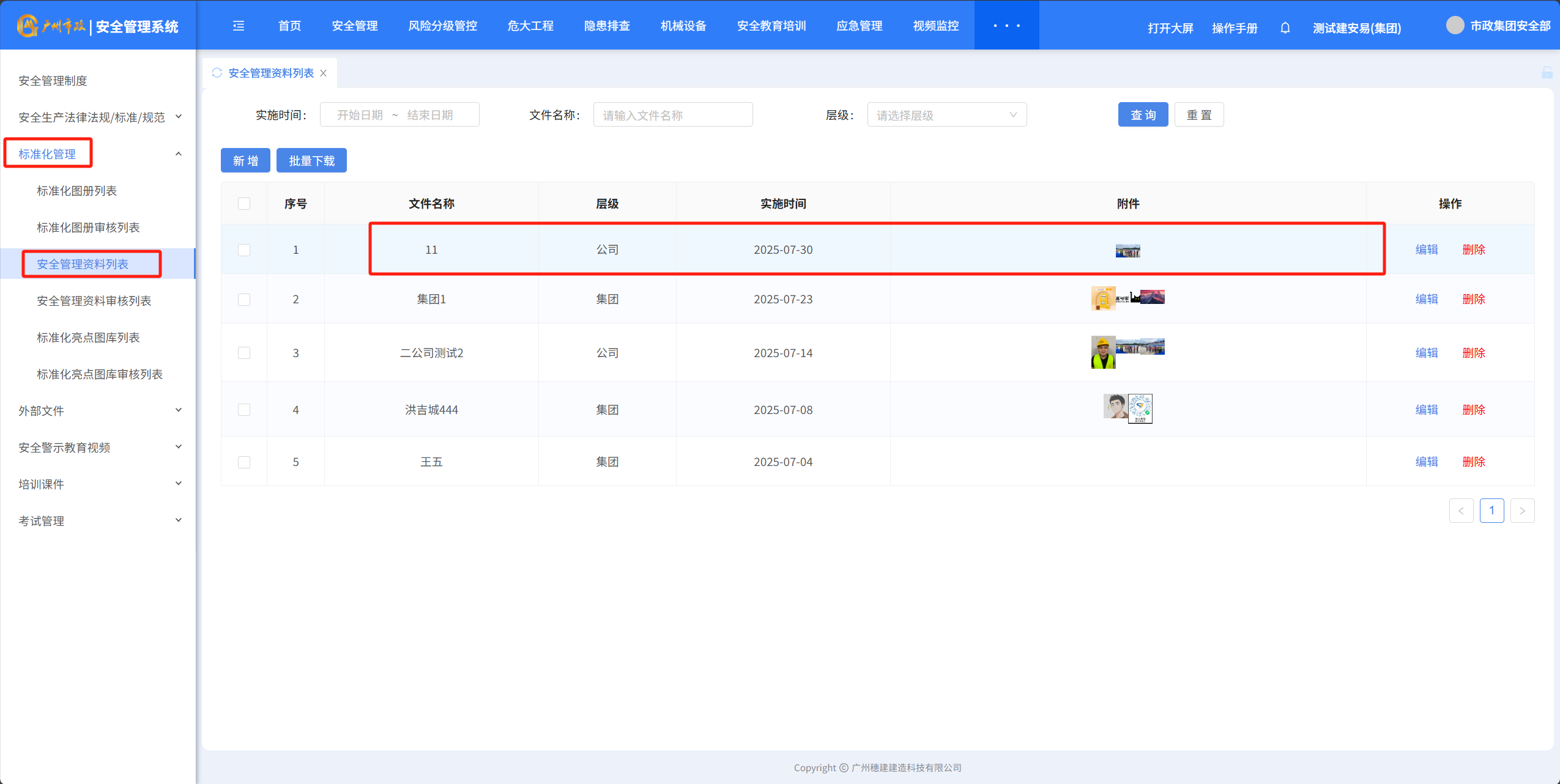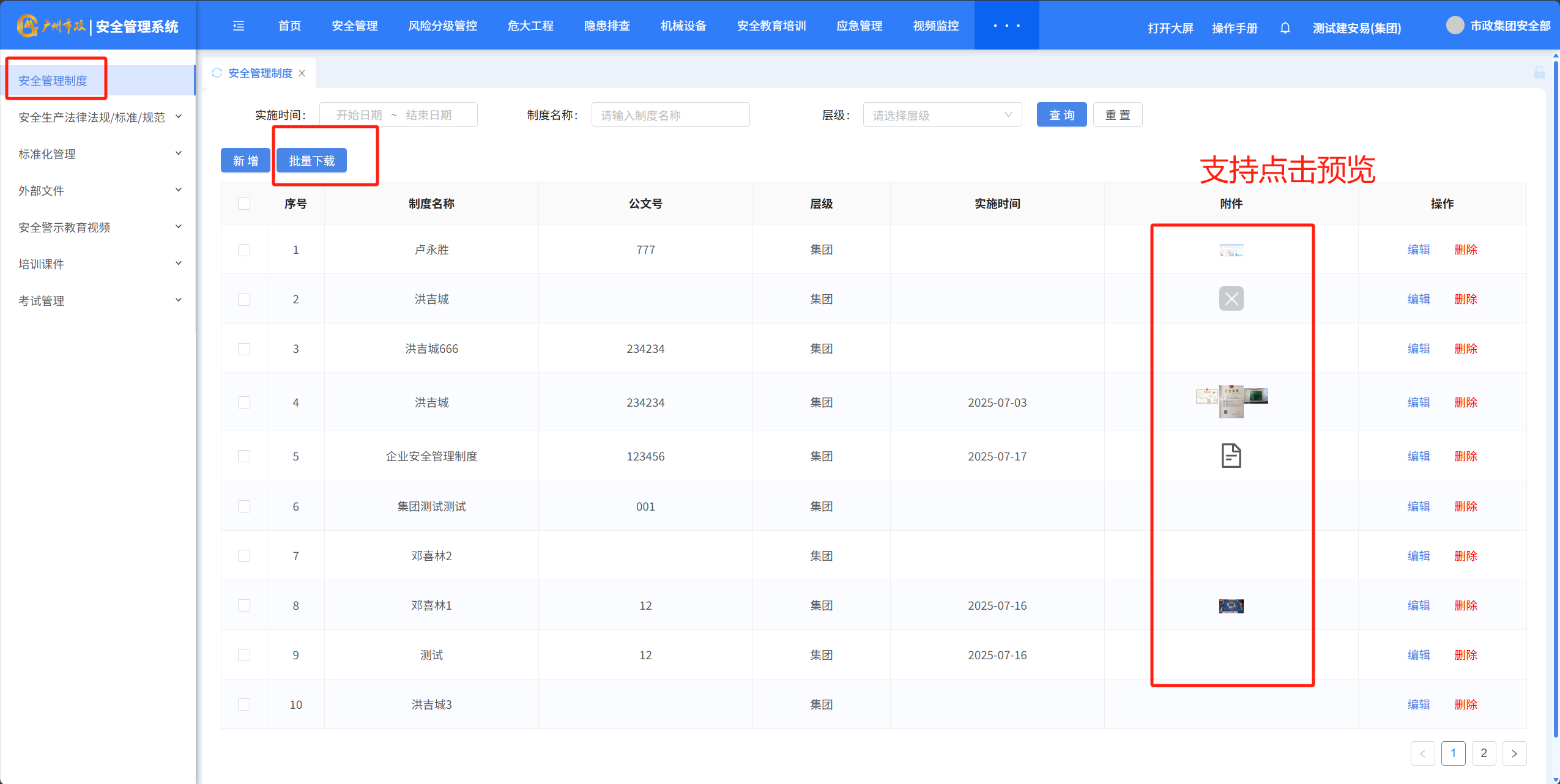 集团安全管理制度页面:(各层级都可看到此页面,只有集团有编辑、删除按钮,其他层级为查看按钮)