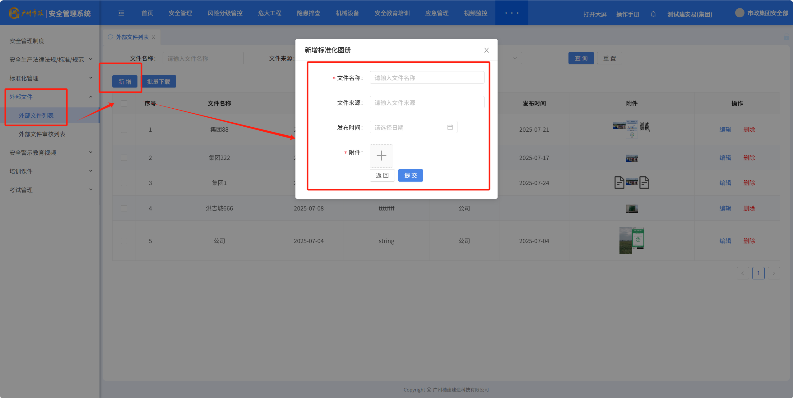 1.集团侧–点击新增按钮,输入文件名称、文件来源、发布时间、附件;点击保存该数据即创建成功