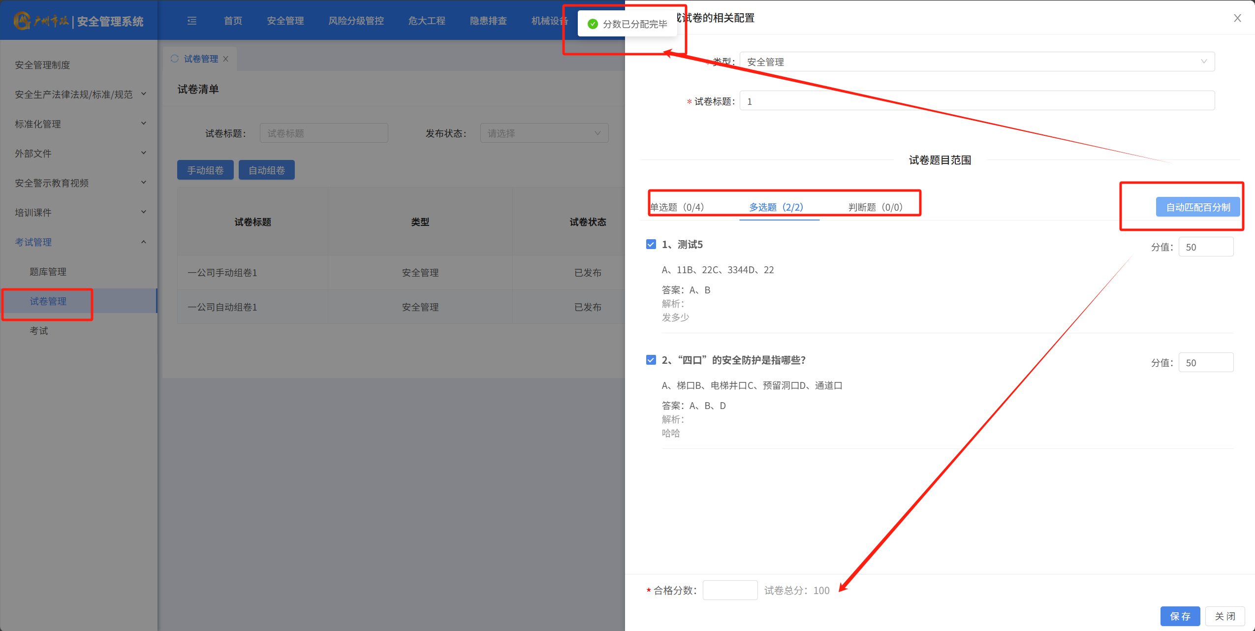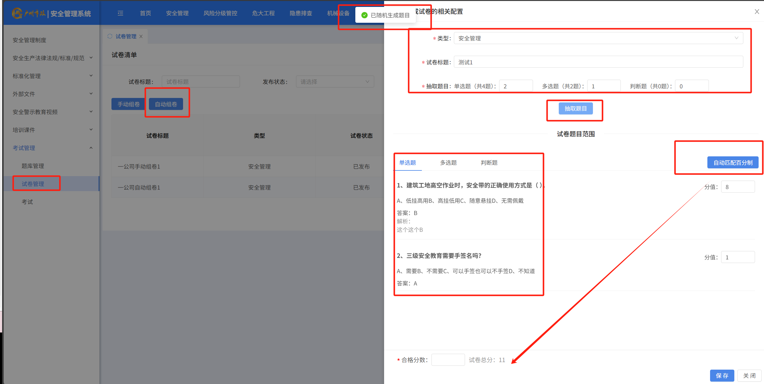点击【自动组卷】,弹出自动组卷页面详情。选择类型后(一级二级可多选)填写试卷标题,输入各类题型的个数后点击【抽取题目】。系统将根据以上条件自动生成试卷。输入合格分数完成组卷。
