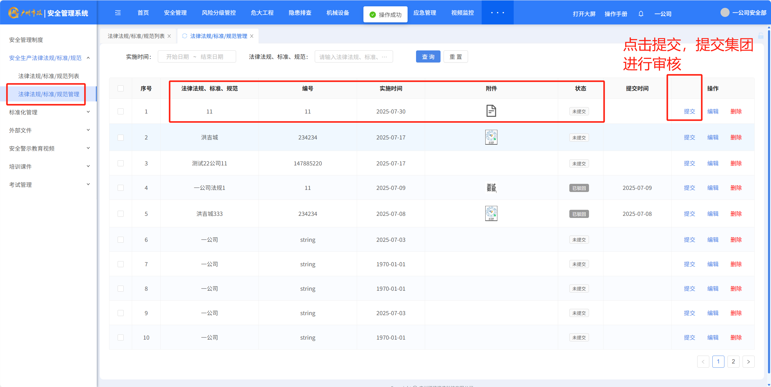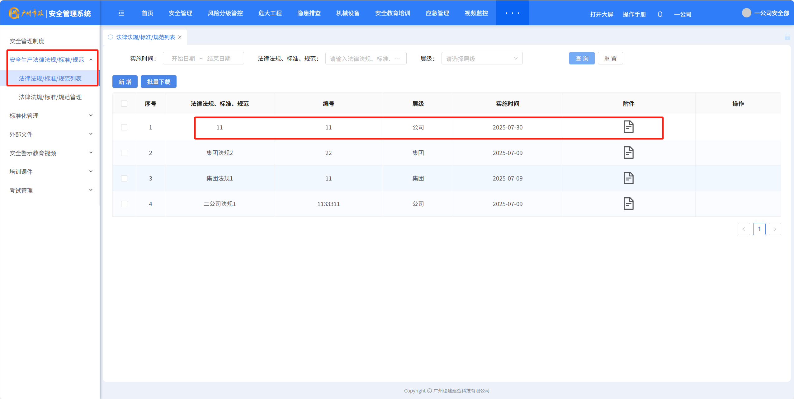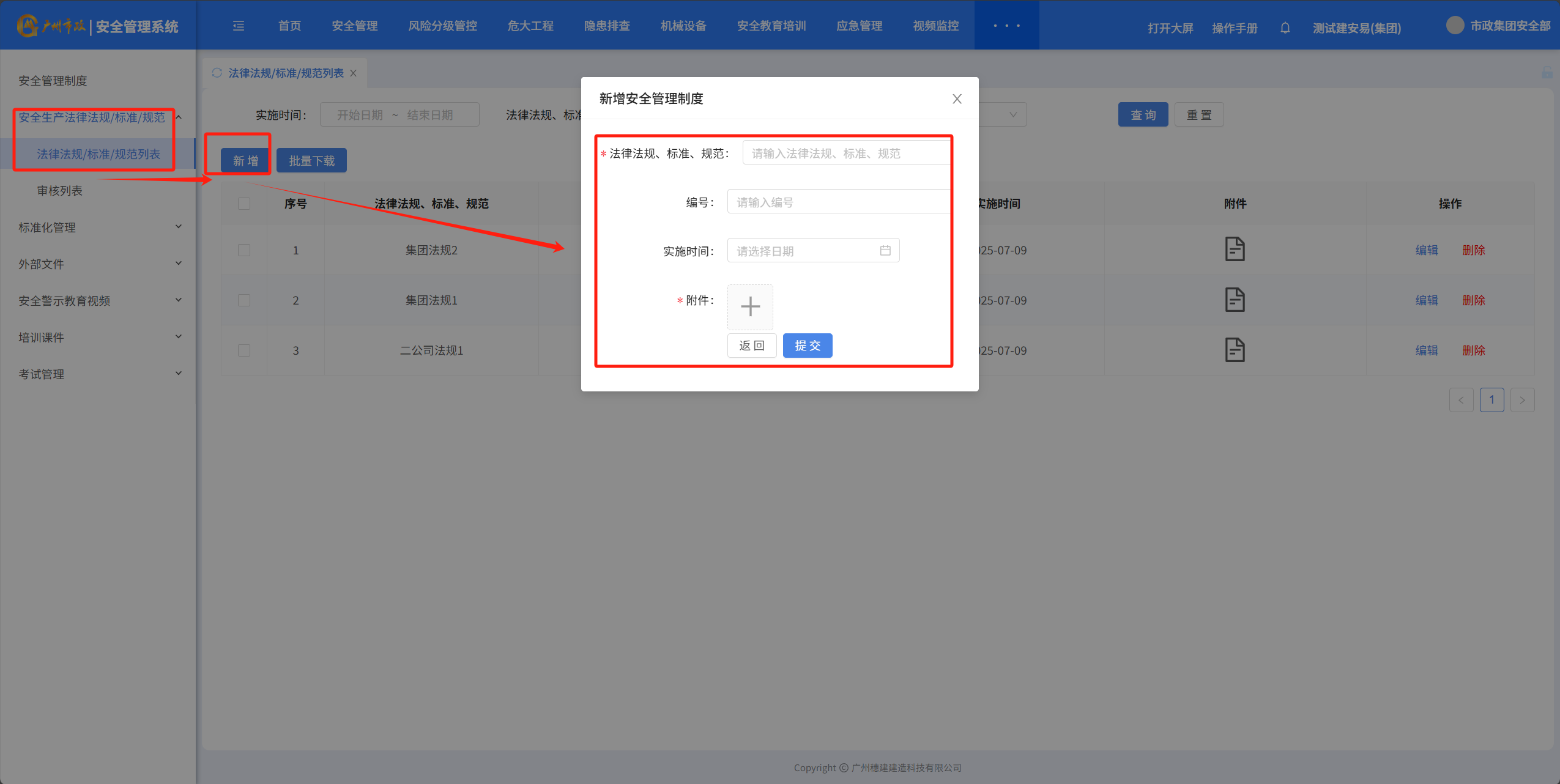 1.集团侧–点击新增按钮,输入法律法规、标准、规范、编号、实施时间、附件;点击保存该数据即创建成功