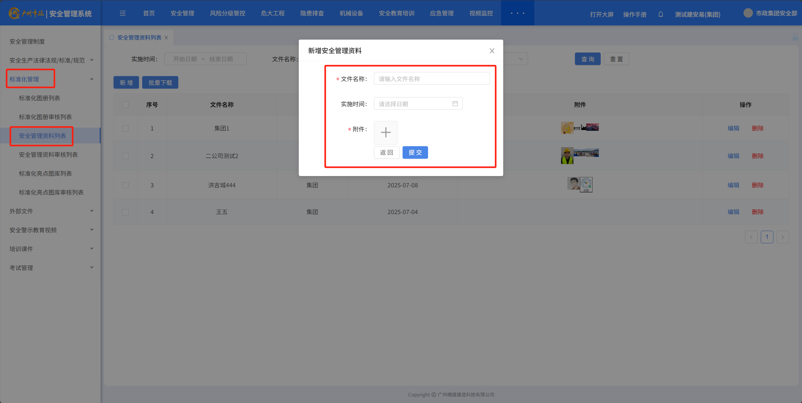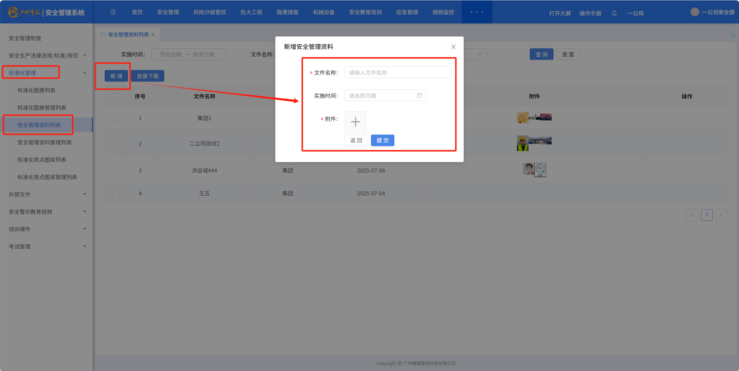 2.公司侧–点击新增按钮,输入文件名称、实施时间、附件;点击保存