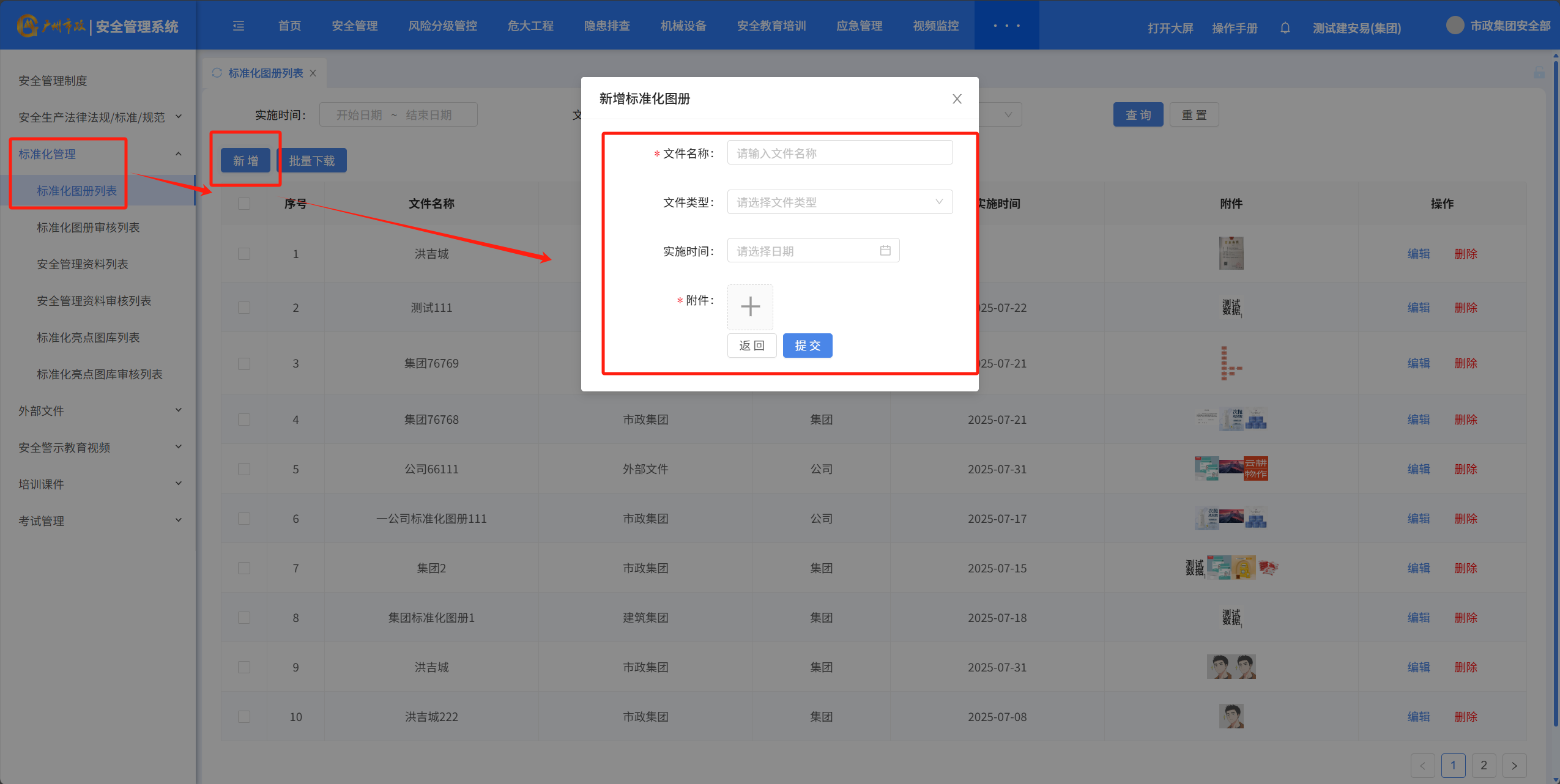 1.集团侧–点击新增按钮,输入文件名称、文件类型、实施时间、附件;点击保存该数据即创建成功