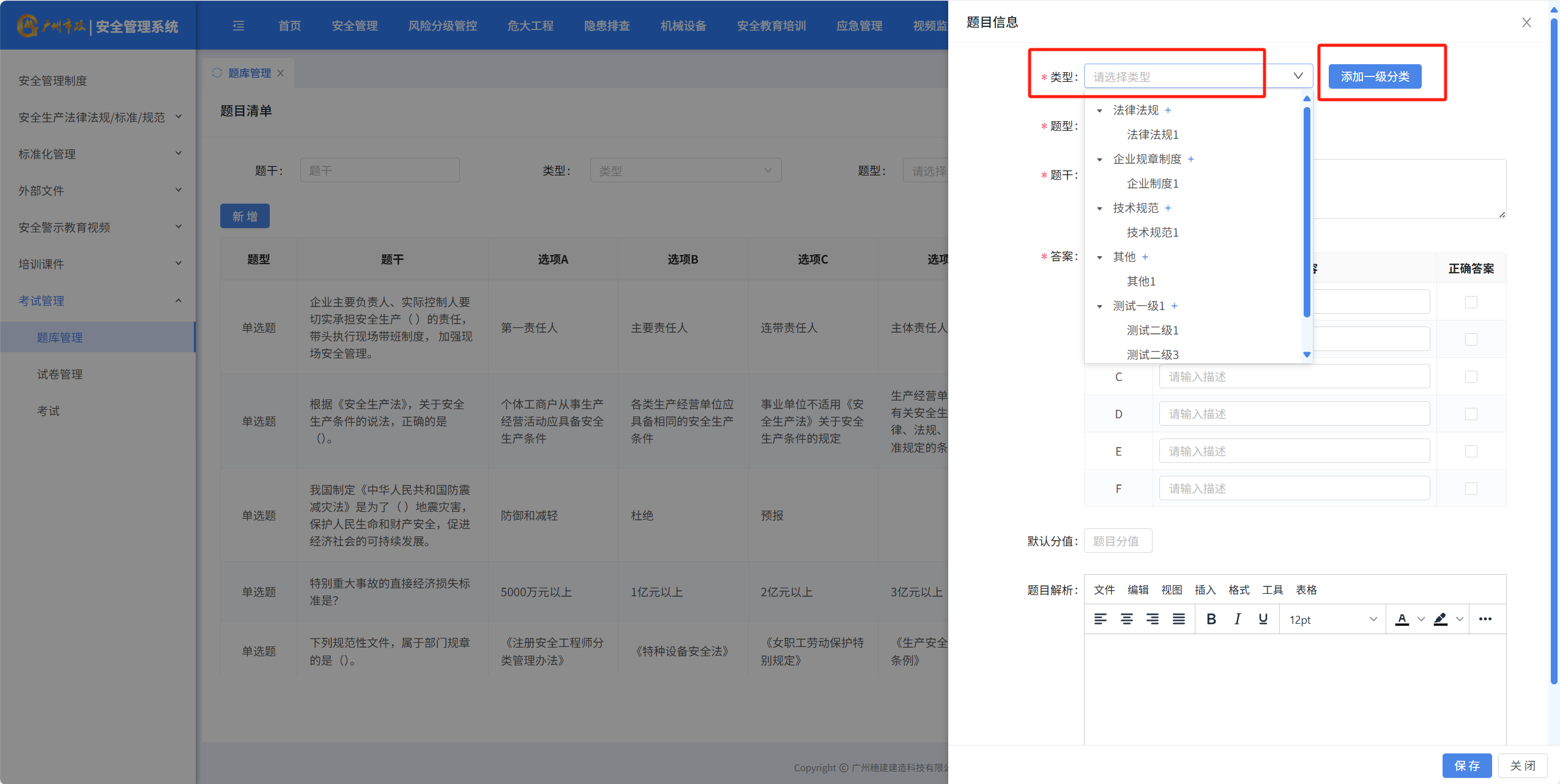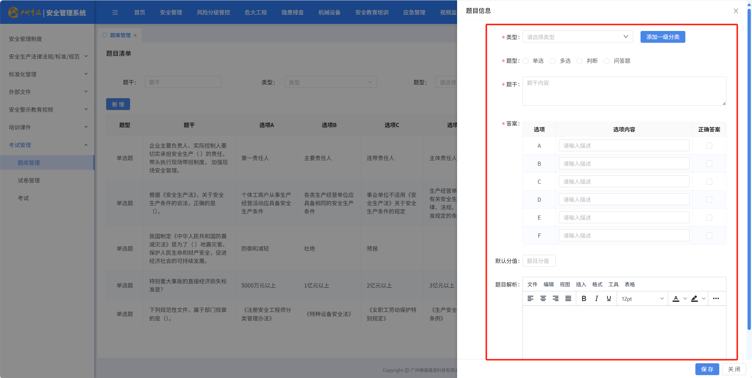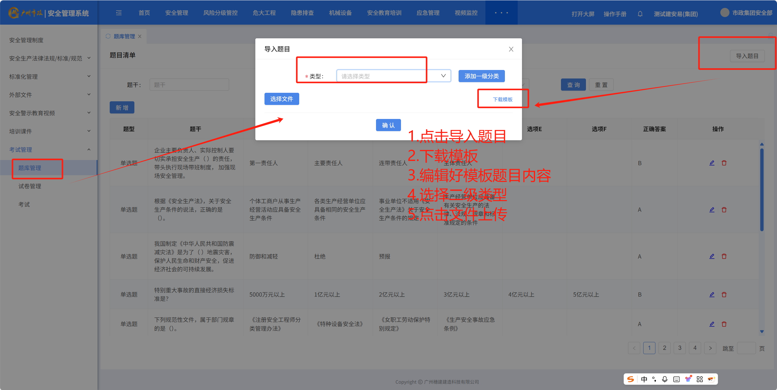 由集团安管部同事新增题库内容,支持手动新增或导入题目两种方式。