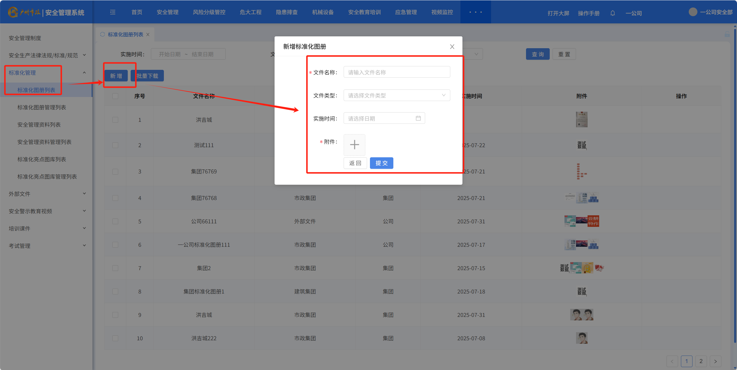 2.公司侧–点击新增按钮,输入文件名称、文件类型、实施时间、附件;点击保存
