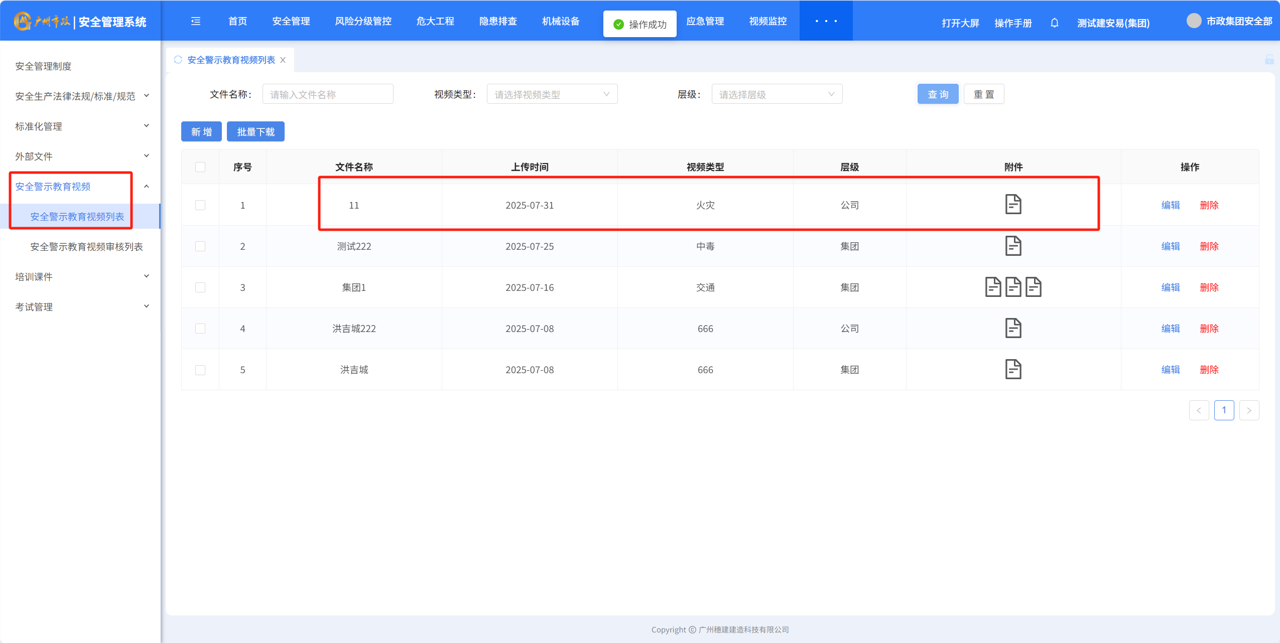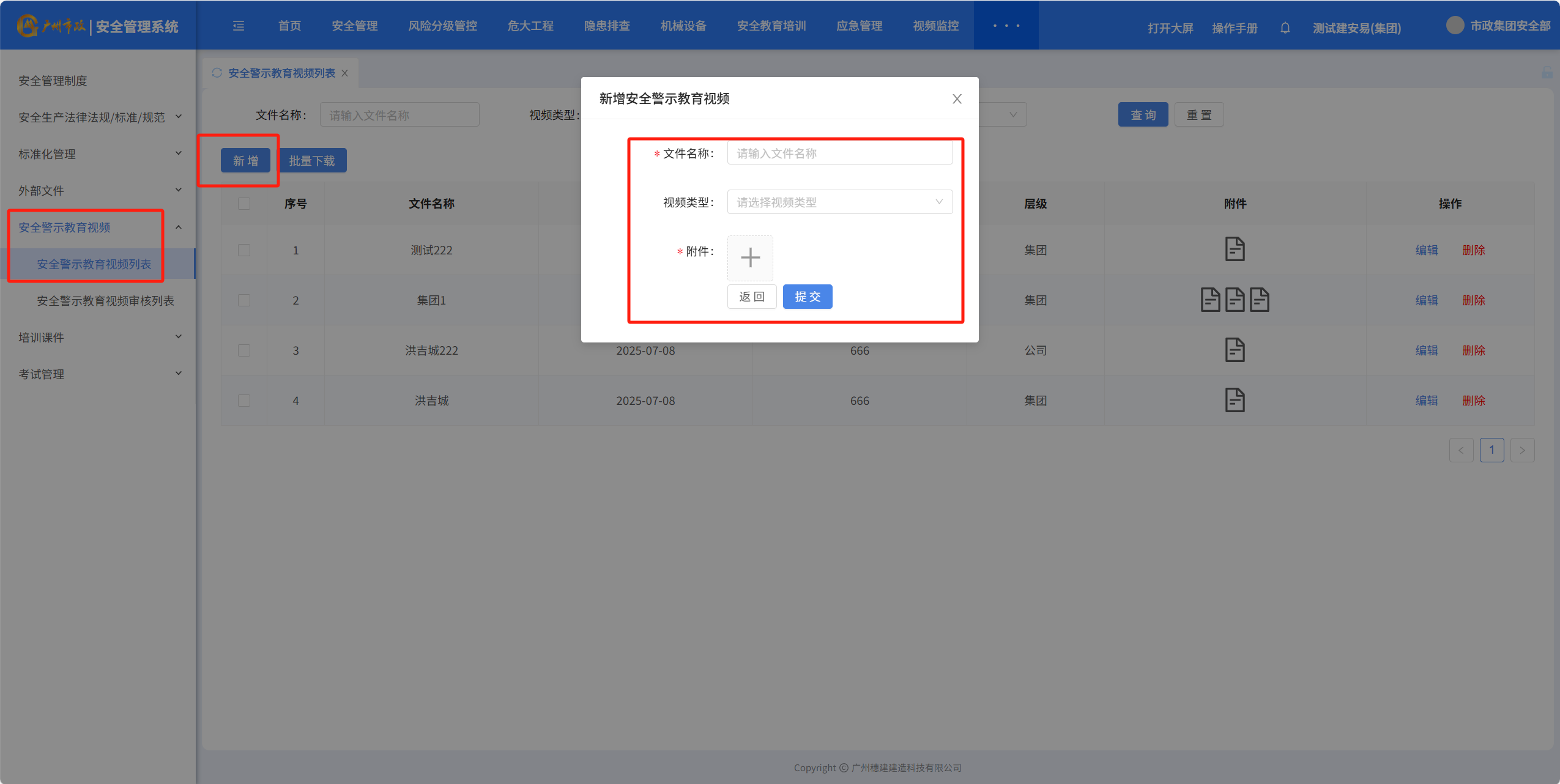 1.集团侧–点击新增按钮,输入文件名称、视频类型、上传视频附件;点击保存该数据即创建成功