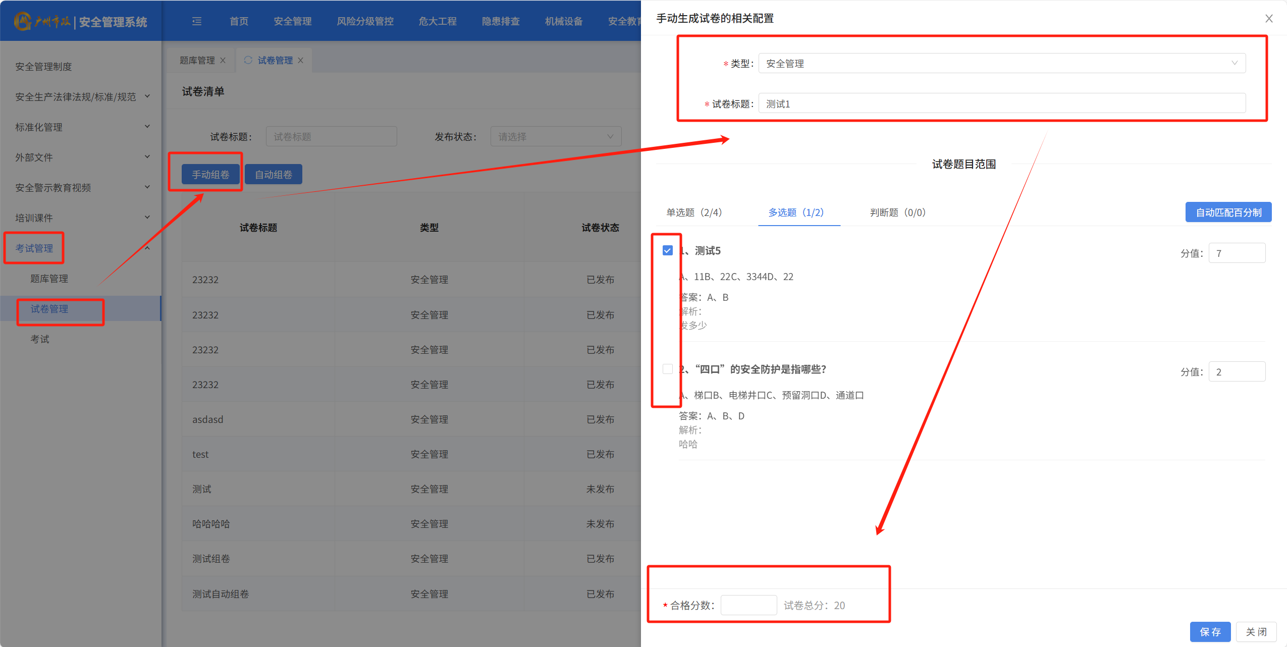 点击【手动组卷】,弹出手动组卷页面详情。选择类型后(一级二级可多选)展示各类型下的题库,填写试卷标题,勾选后需要的题目,输入合格分数完成组卷。试卷总分=每个题目的默认分数之和。