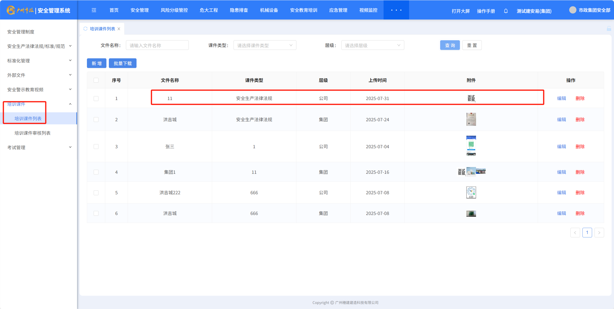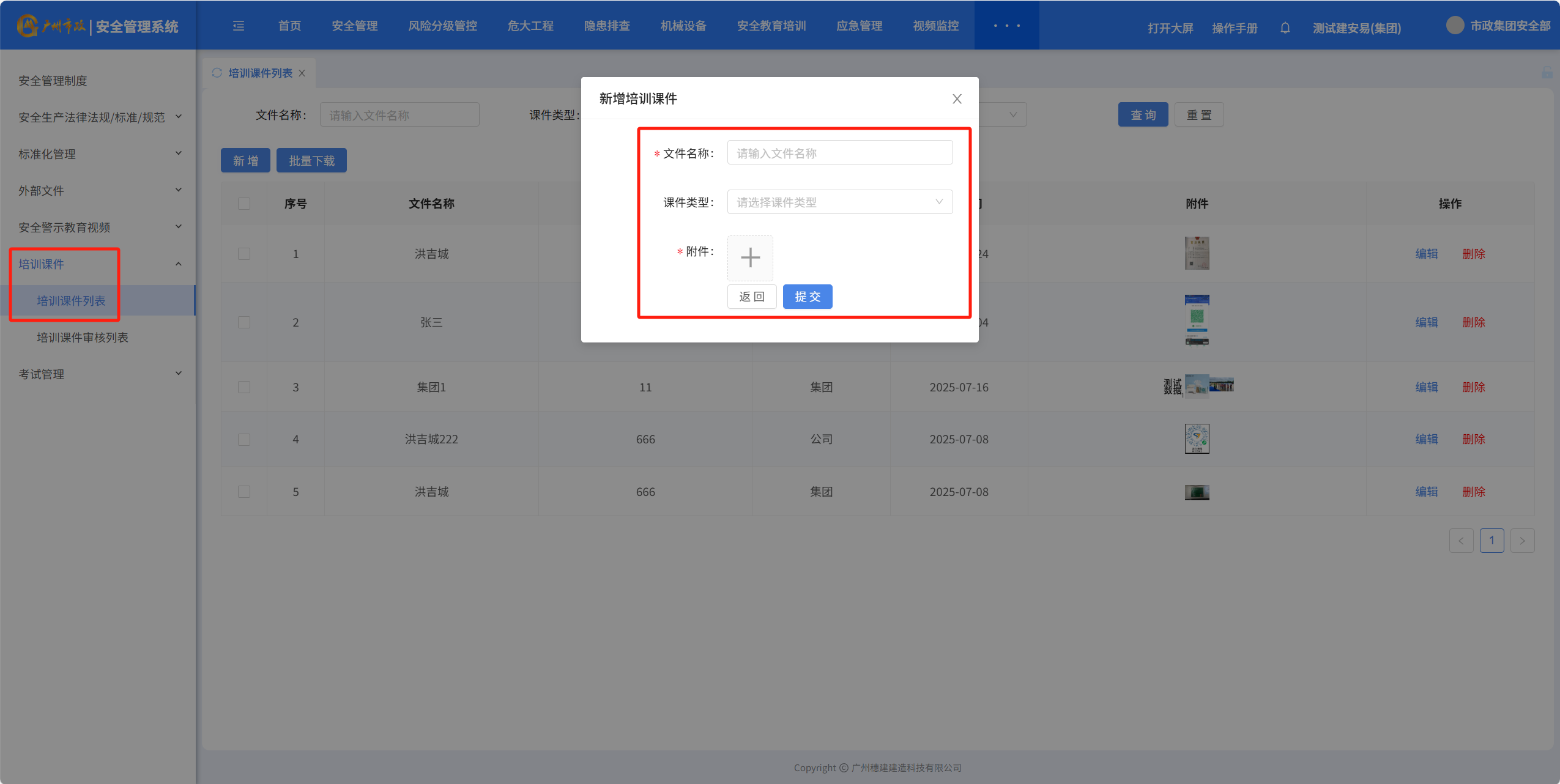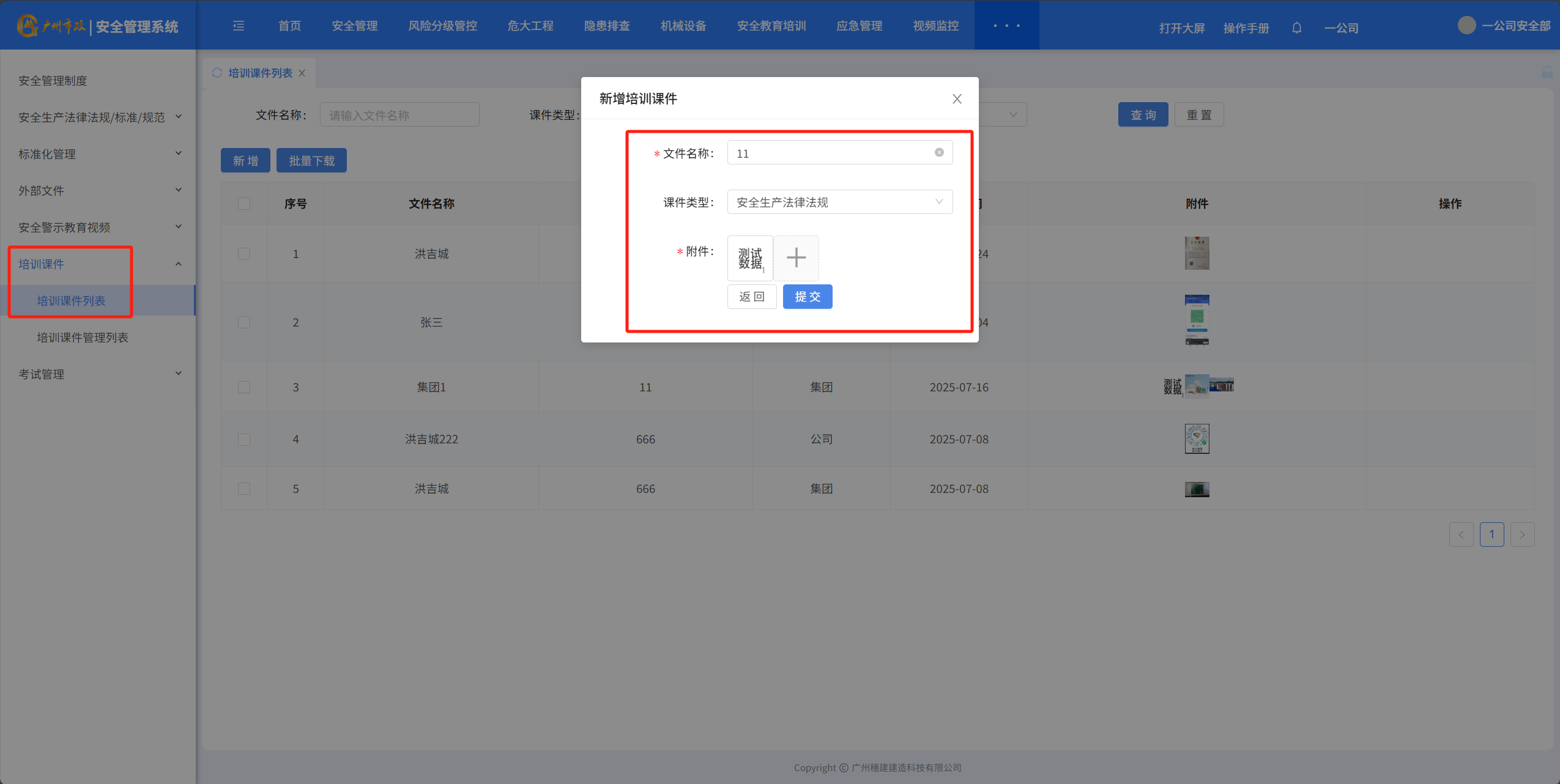 2.公司侧–点击新增按钮,输入文件名称、课件类型、上传附件;点击保存