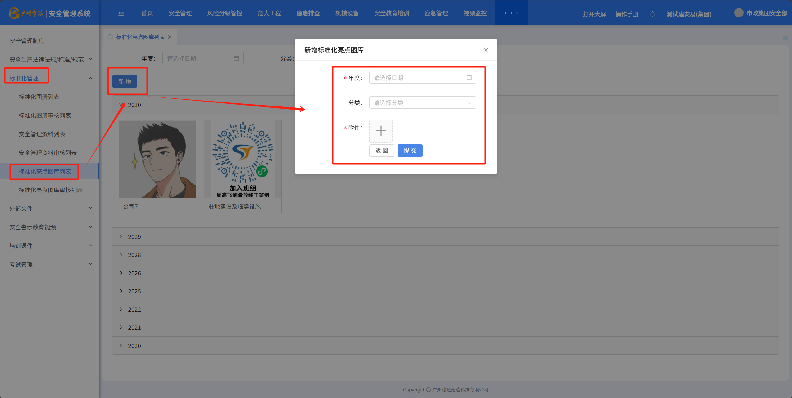 1.集团侧–点击新增按钮,输入年度、分类、附件;点击保存该数据即创建成功