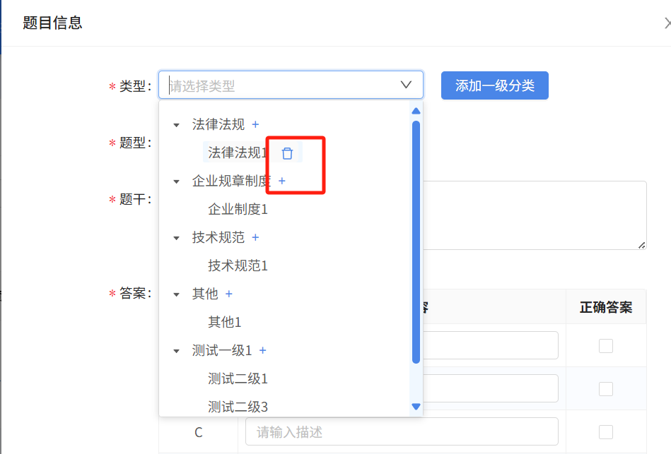 (同时支持新增二级类型,点击“+”号可新增题库二级类型,点击“+”按钮后,直接在树形结构中插入一个可编辑的输入框,输入后确定即添加成功)