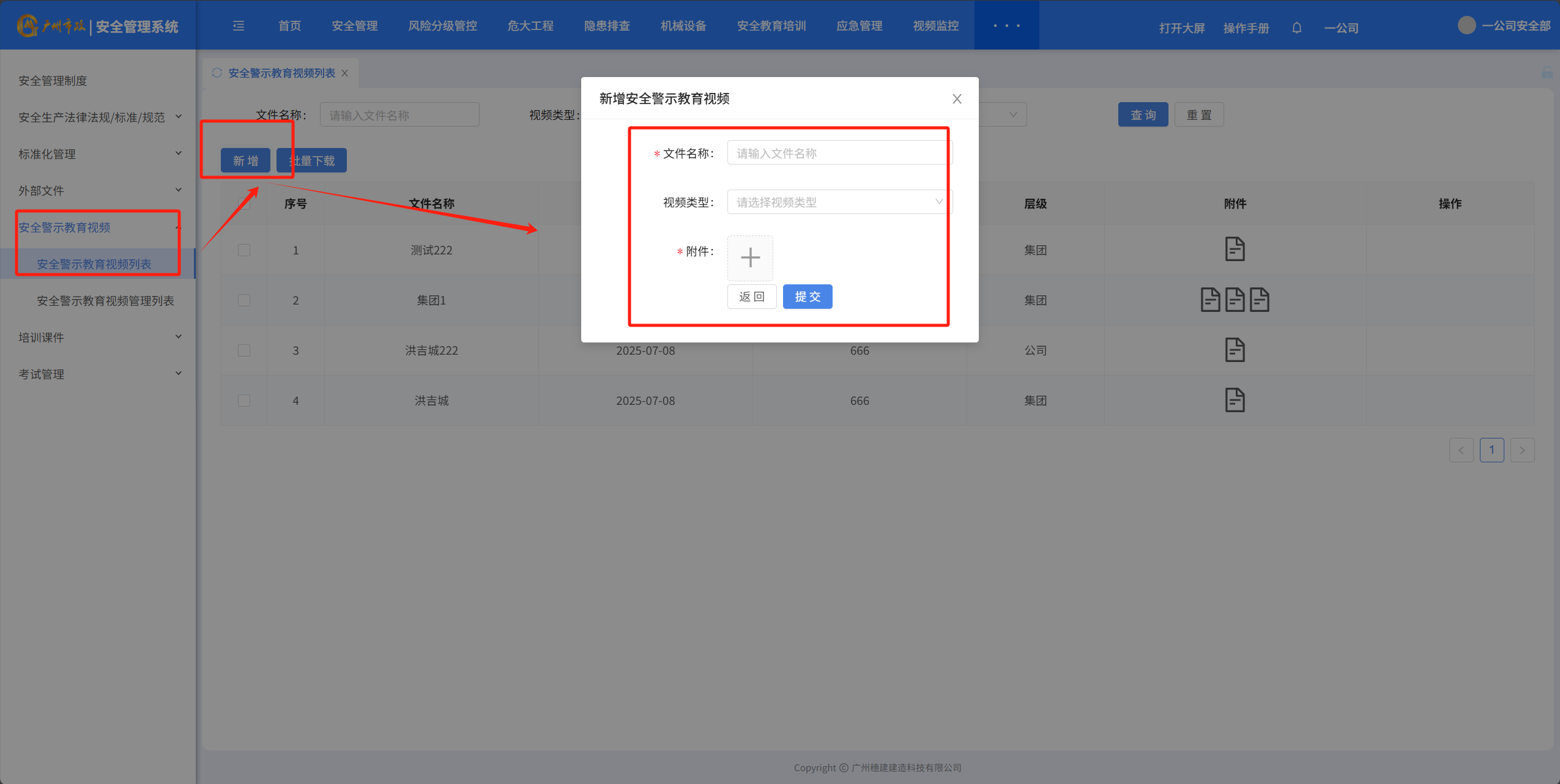 2.公司侧–点击新增按钮,输入文件名称、视频类型、上传视频附件;点击保存