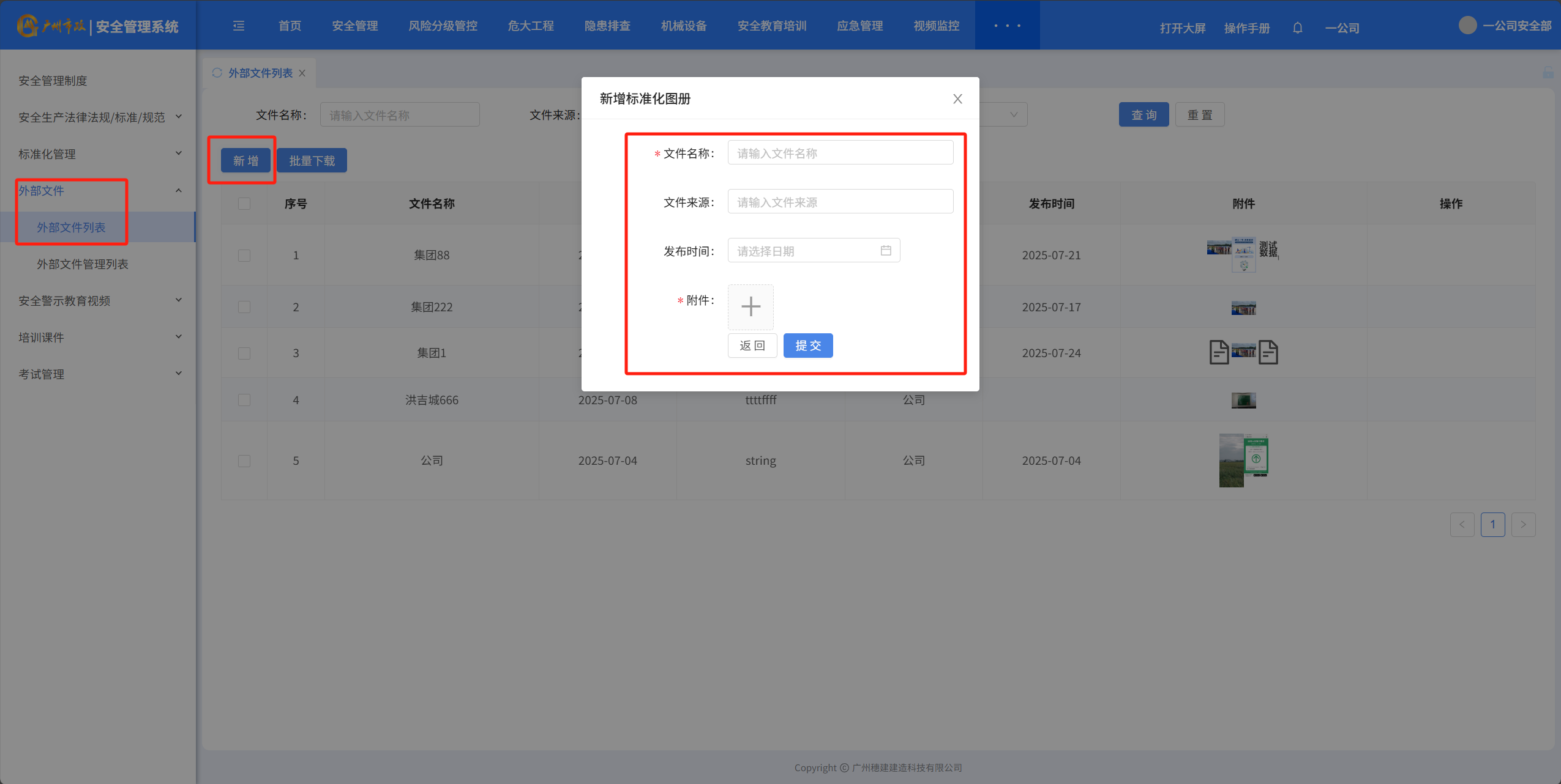 2.公司侧–点击新增按钮,输入文件名称、文件来源、发布时间、附件;点击保存