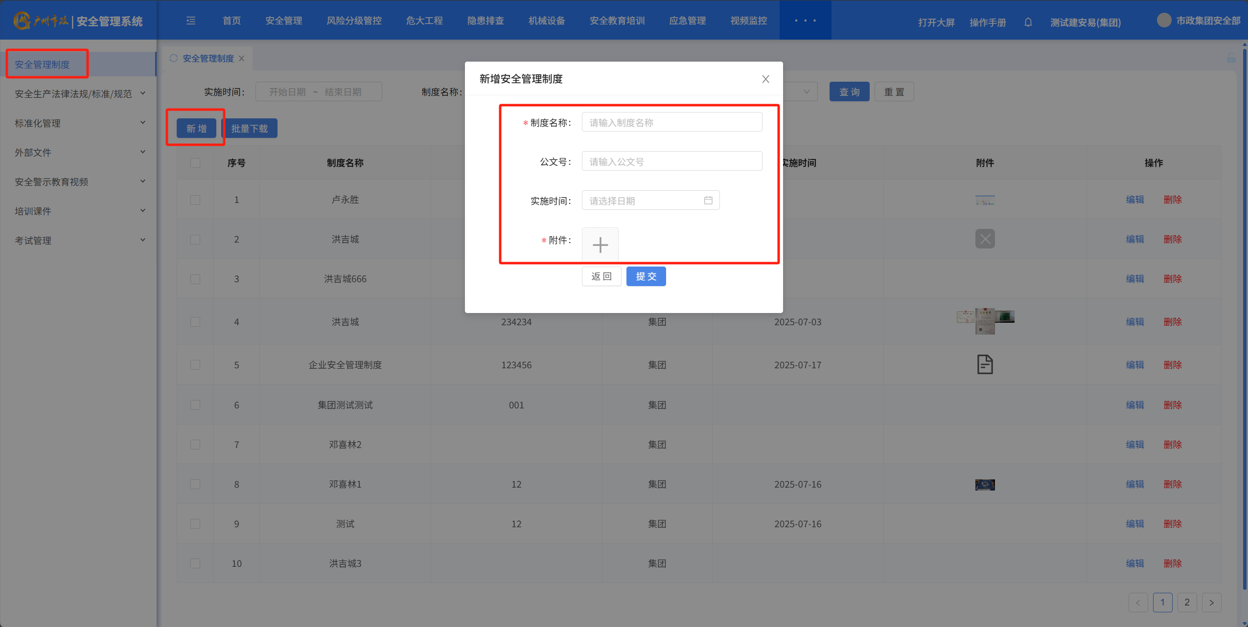 1.点击新增按钮,输入制度名称、公文号、实施时间、附件;点击保存;即创建成功