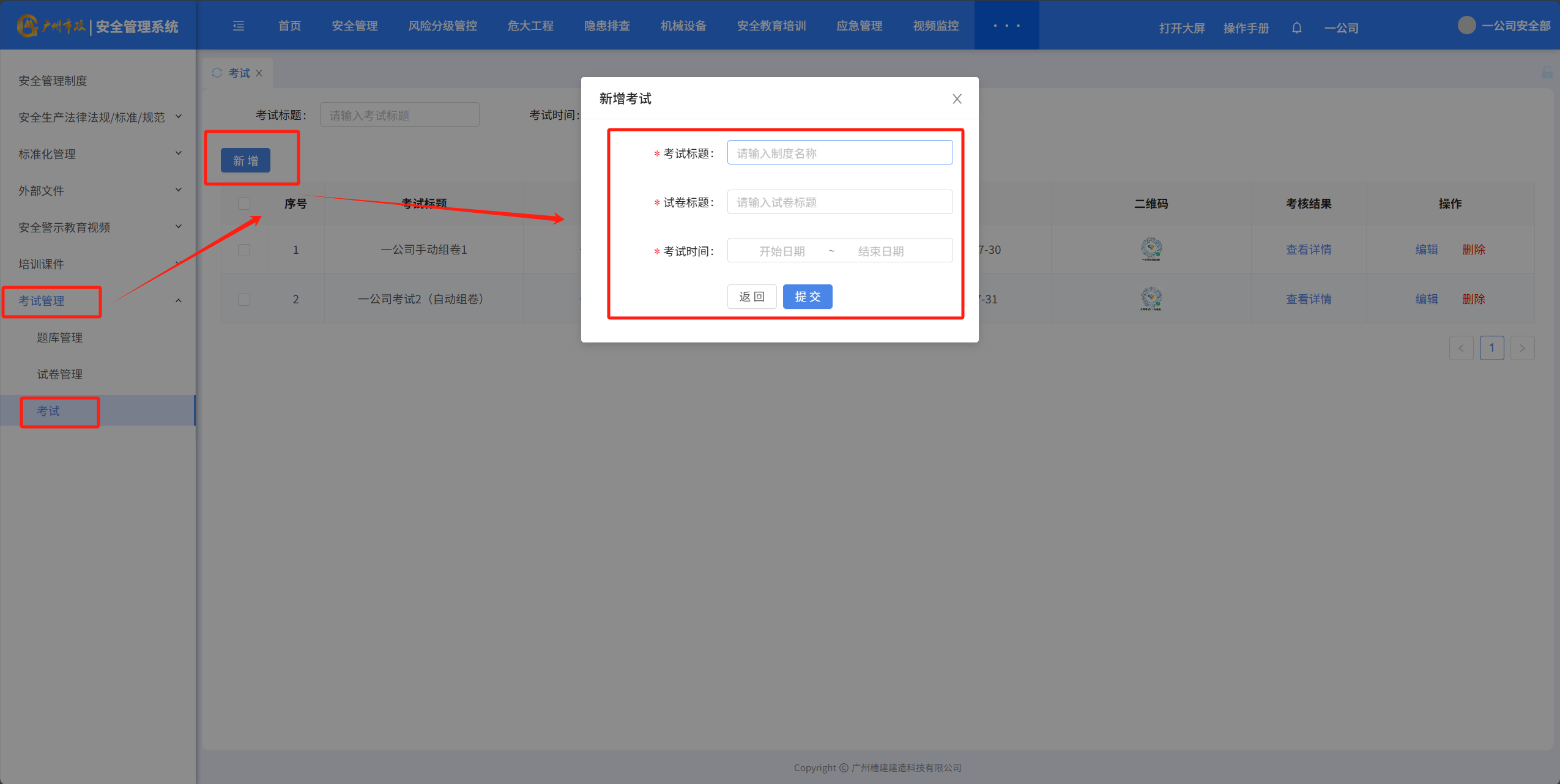 (1)点击新增,输入考试标题,输入试卷带出进行选择,输入考试时间区间,提交即可创建考试计划
