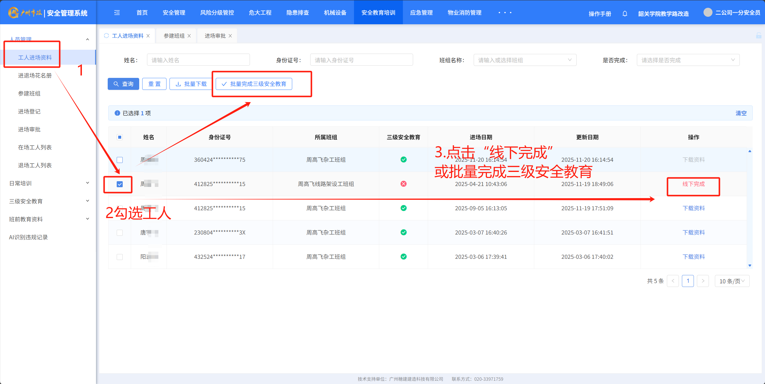 当工人入场后未完成三级安全学习任务时,项目安全员/劳务员可手动勾选其已线下完成安全教育