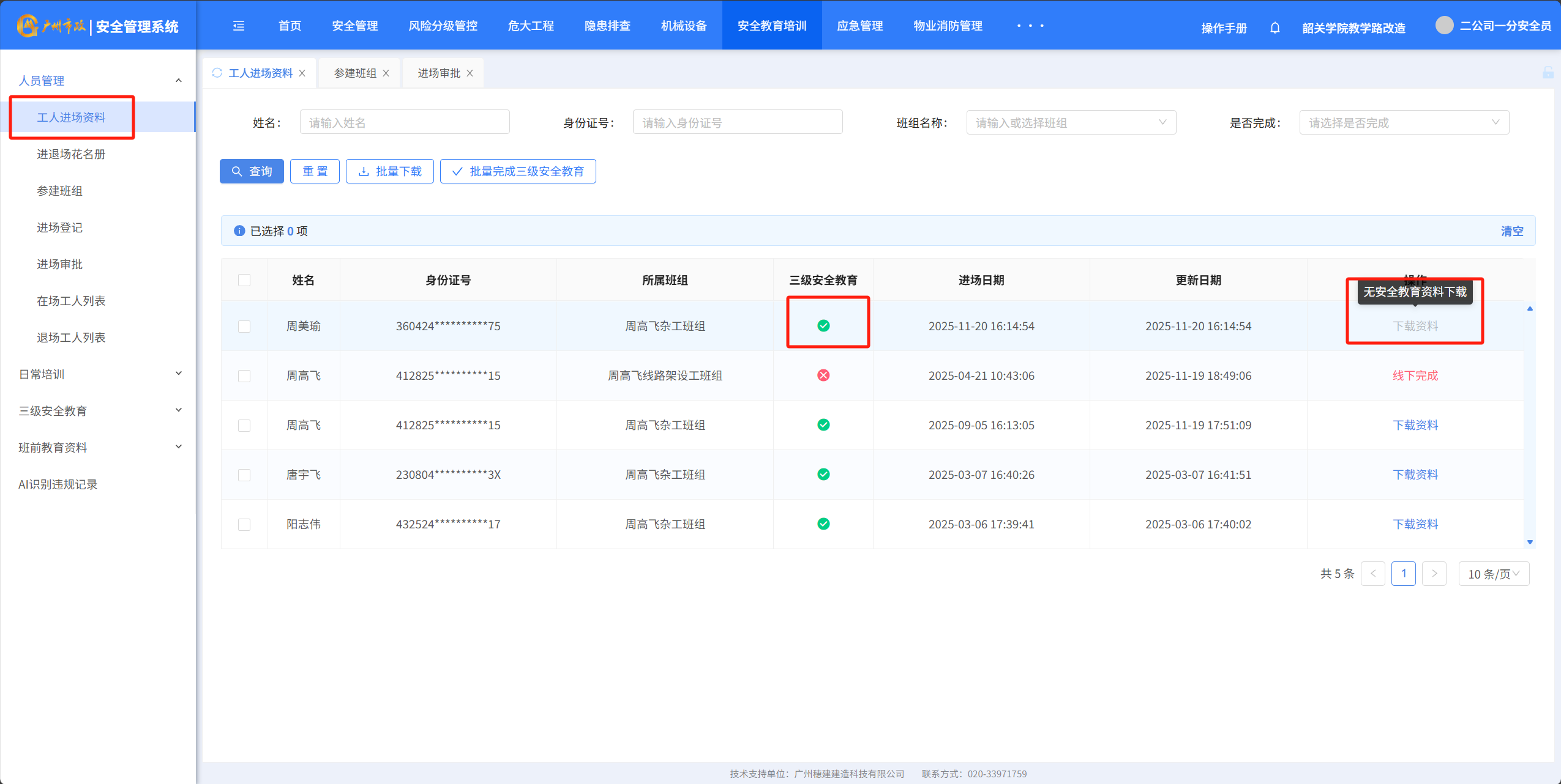 3.操作后该工人三级安全教育状态变更为“已完成”;