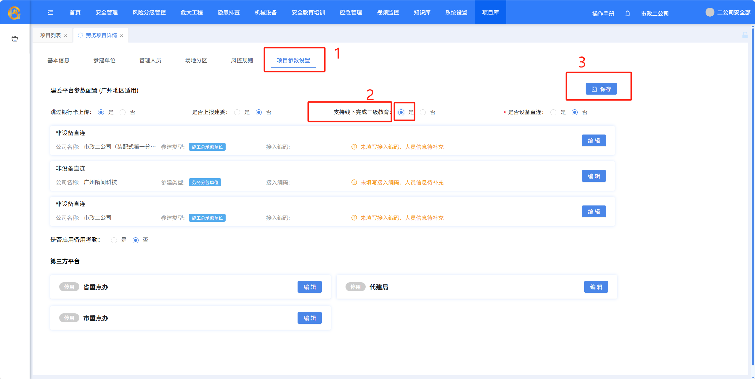 3.点击“项目参数设置”、勾选“支持线下完成三级教育”为“是”;点击保存设置成功。启用“线下完成三级安全教育”功能