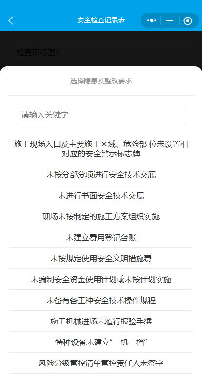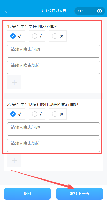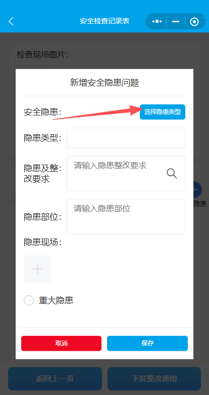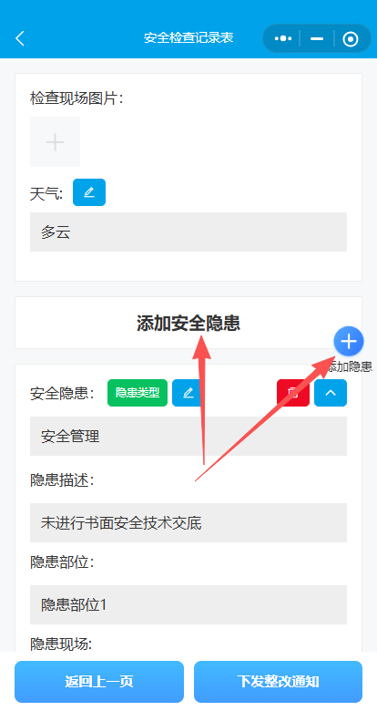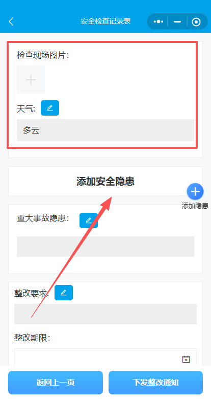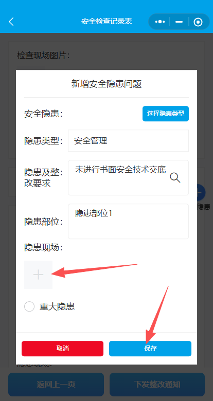 8.填写 14 个专项后,上传检查现场图片,点击加号添加安全隐患