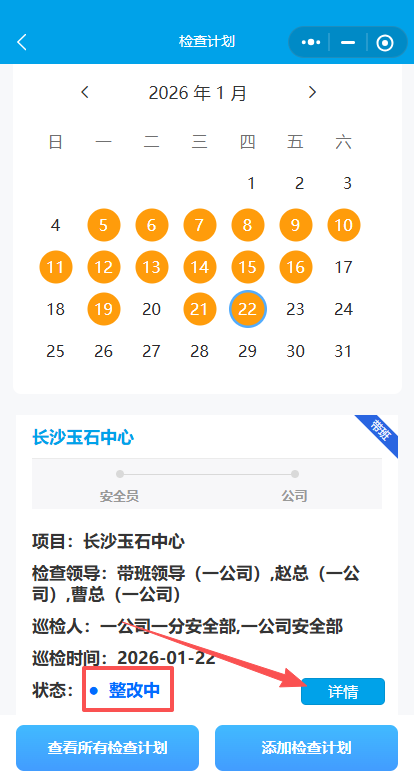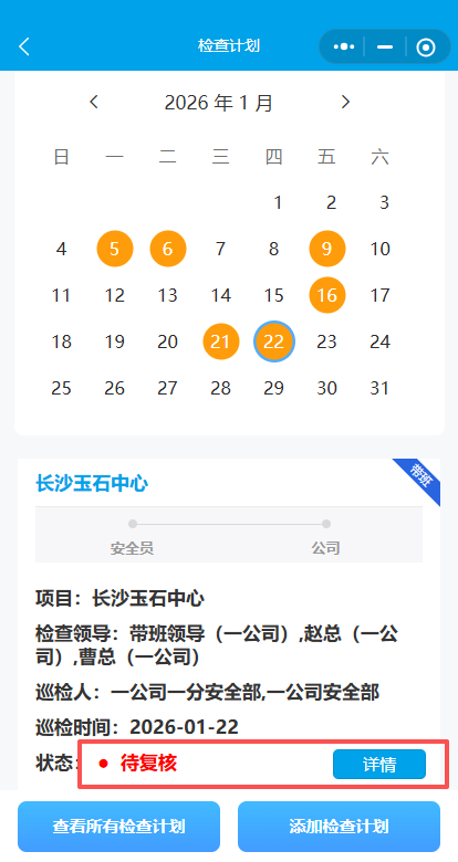 12.等待项目安全员提交整改措施后检查单变成待复核状态,点击详细,检查人选择复核意见。