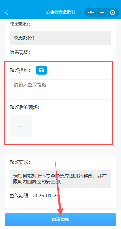 11.项目安全员填写整改措施并上传附件,点击“提交复核