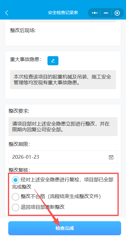 (共三种复核结果:1.项目已完成整改、2.整改不合格(流程结束生成整改文件)、3.退回项目重新整改)