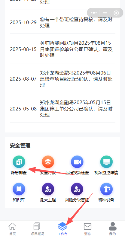 12.3 选择退回项目重新整改,点击检查完成按钮,该笔巡检单状态重新变更为“整改中”退回项目部重新进行整改。
