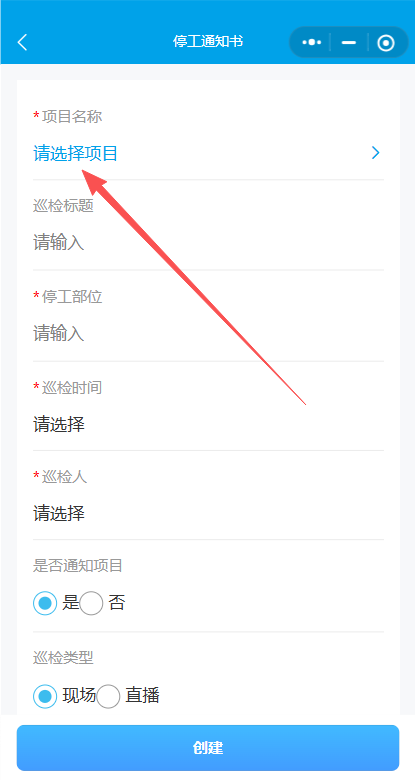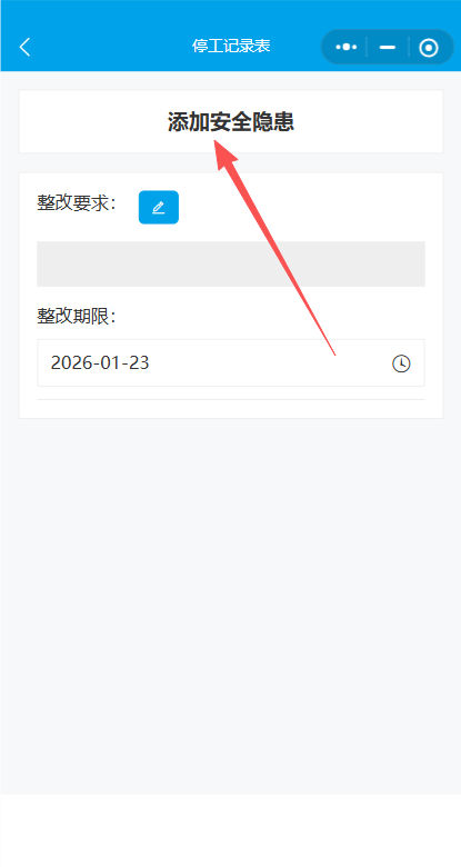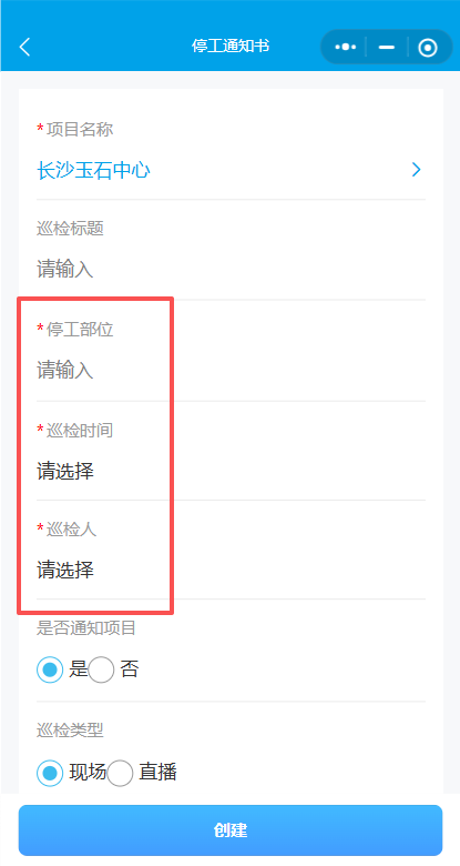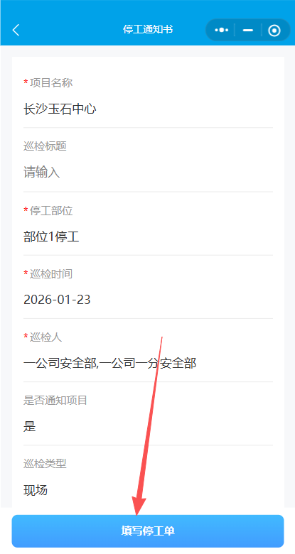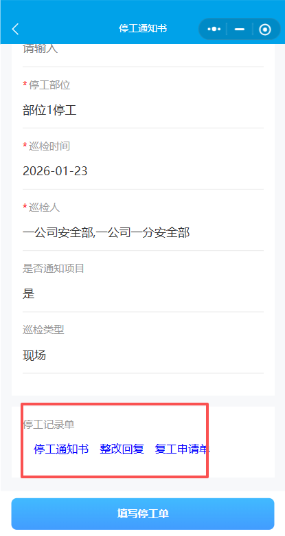 4.输入停工部位、选择检查时间、选择巡检人 (公司安全部门人员、分公司安全部门人员)