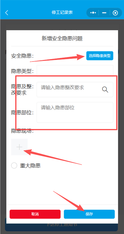 6.进入页面添加安全隐患问题,输入隐患部位上传照片附件点击保存, 如果有多条安全隐患问题,点击加号进行添加。
