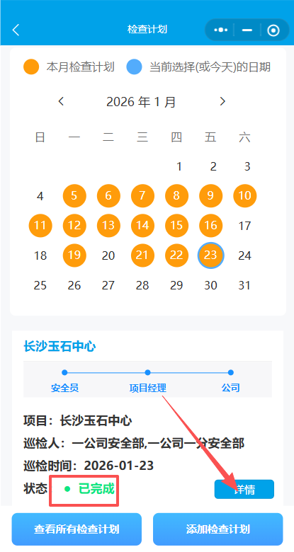 11.1选择项目已完成整改,点击检查完成按钮,返回检查计划列表再次进入刚刚的检查计划,下面会生成完整检查记录单、整改回复的文件。完成检查计划流程。