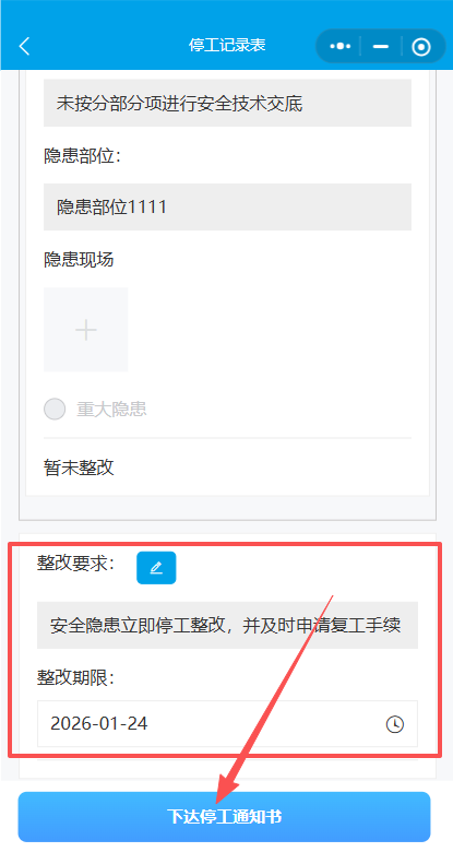 7.输入整改要求、整改期限后,点击下发停工通知书