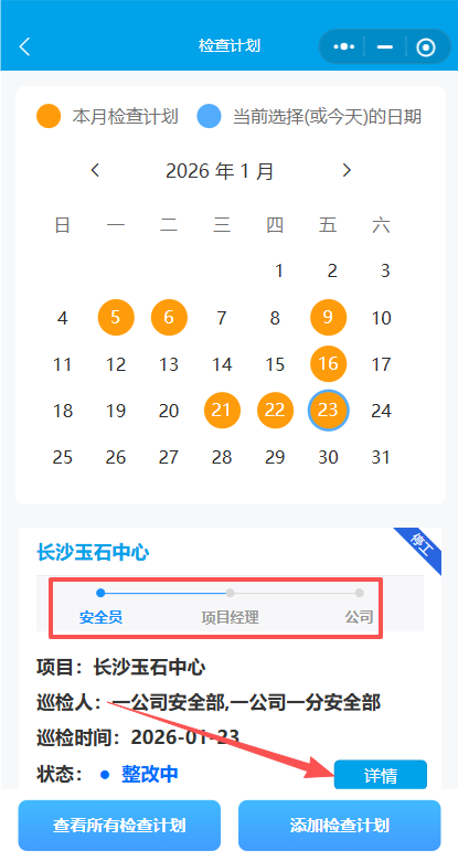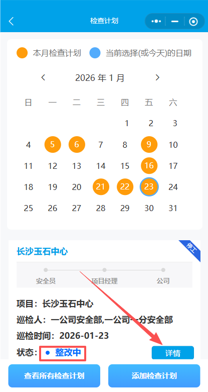 11.3选择退回项目重新整改,点击检查完成按钮,该笔巡检单状态重新变更为“整改中”退回项目部重新进行整改。