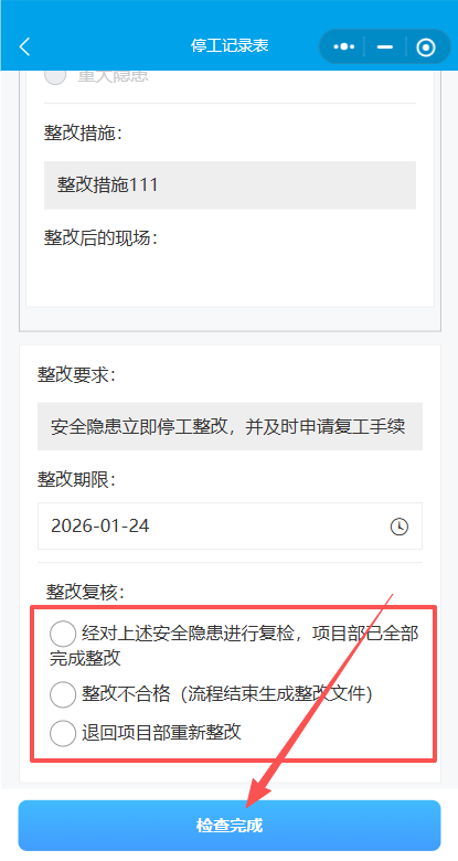 (共三种复核结果:1.项目已完成整改、2.整改不合格(流程结束生成整改文件)、3.退回项目重新整改)