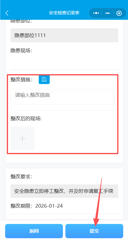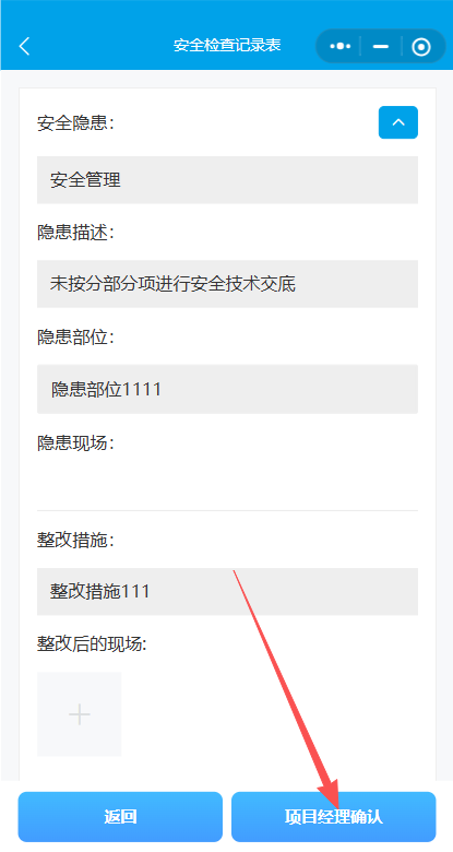 8.项目安全员对隐患进行整改并提交项目经理确认是否整改完毕。