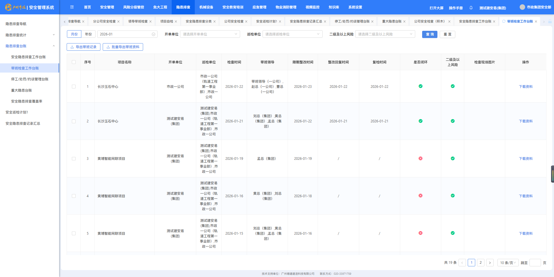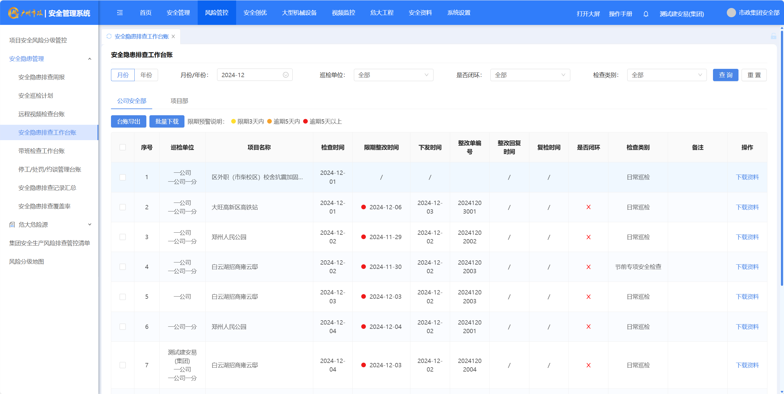 点击菜单进入安全隐患排查工作台账页面,筛选日期、工程管理部、是否闭合、检查类别,检查部门进行安全隐患排查工作台账查询,并可以下载安全检查资料,以及导出台账。