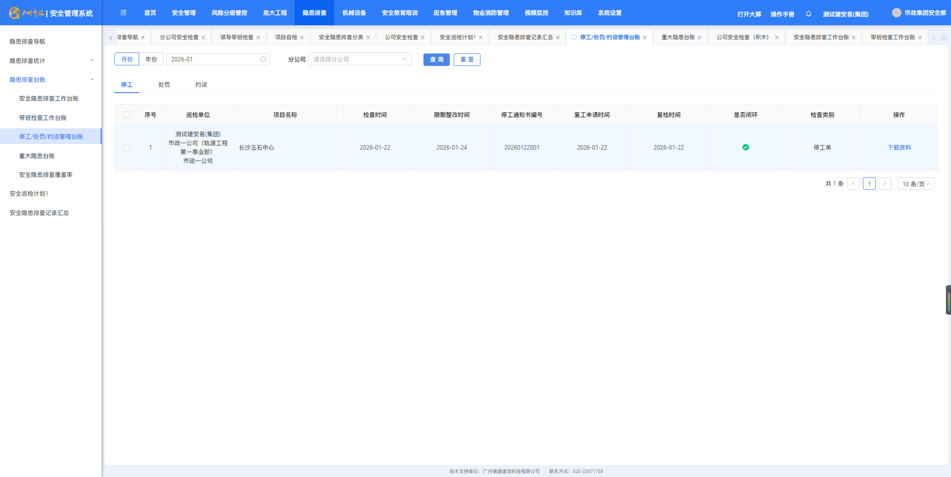 停工/处罚/约谈台账页面,以年/月份筛选,查询停工通知书、处罚通知书和约谈,点击 下载资料,可以下载该项目的停工处罚资料。