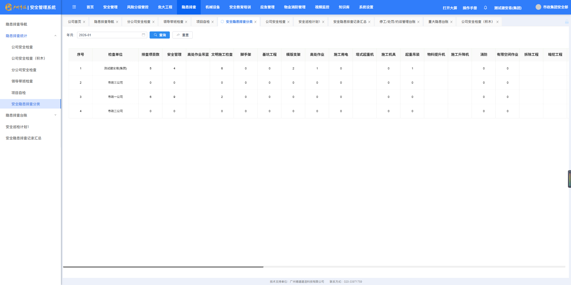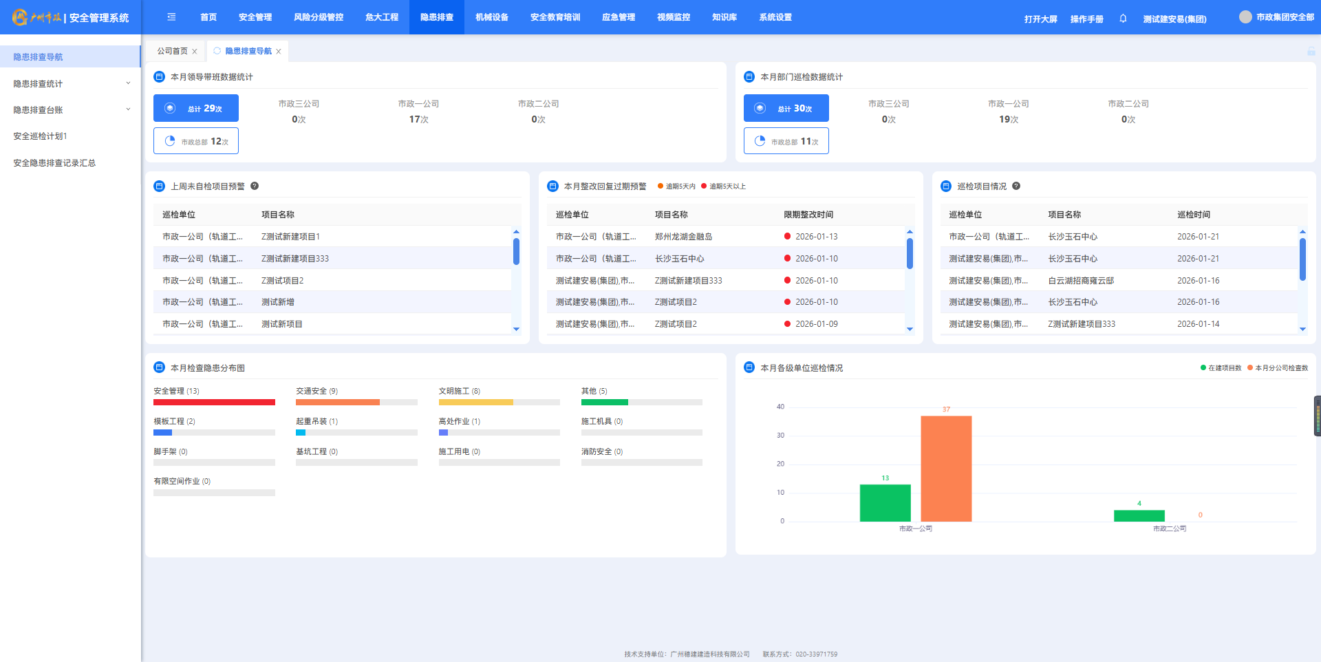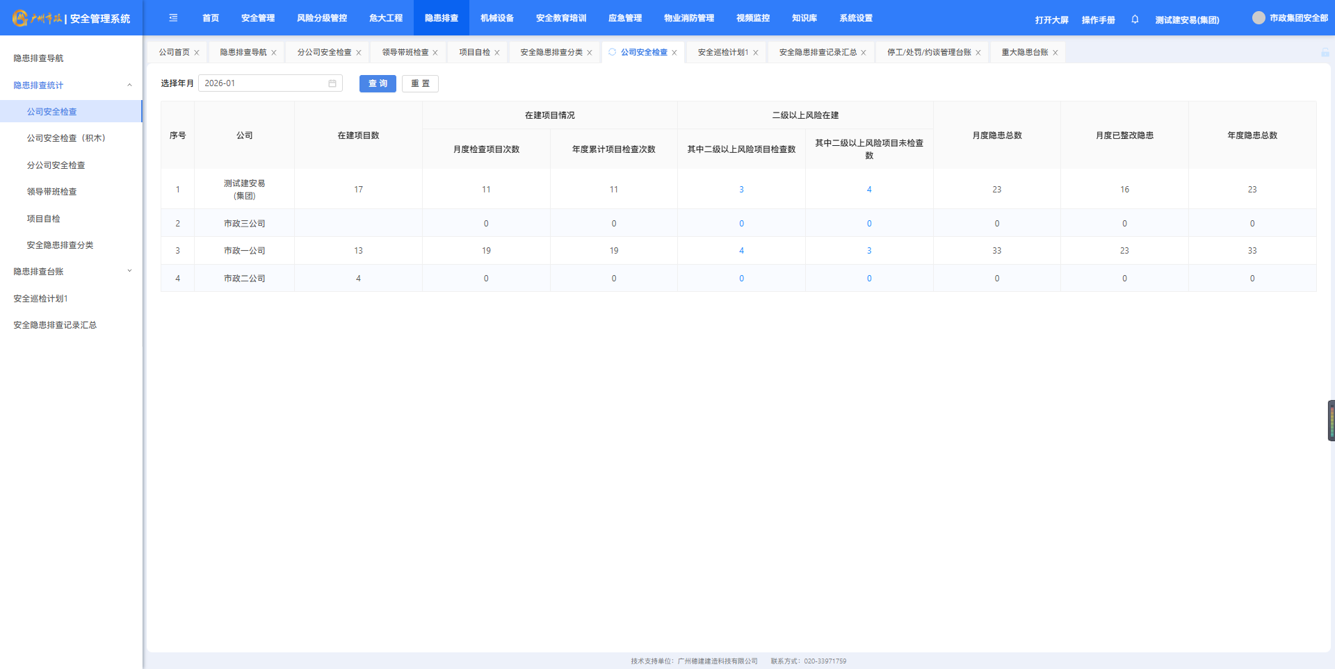 用户登录进入首页,可以查看到所在层级的所有安全隐患排查汇总统计信息。