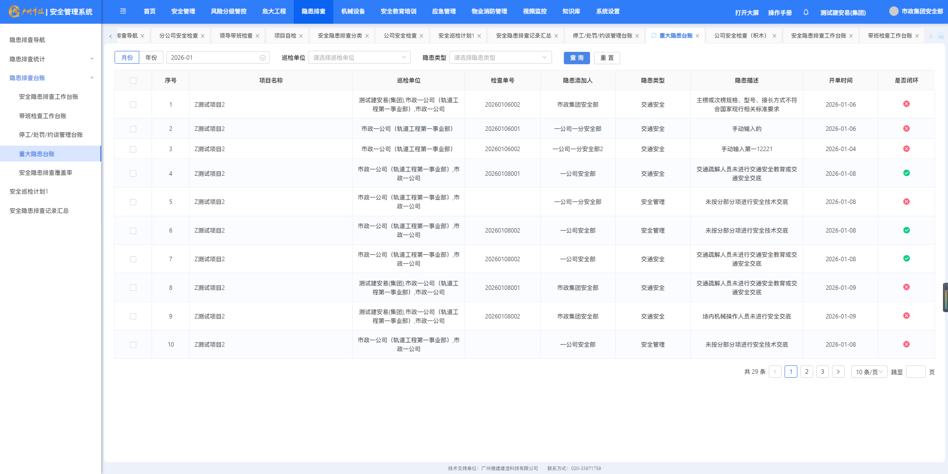 重大隐患台账页面,可筛选日期、巡检单位、隐患类型,查询巡检的重大隐患。