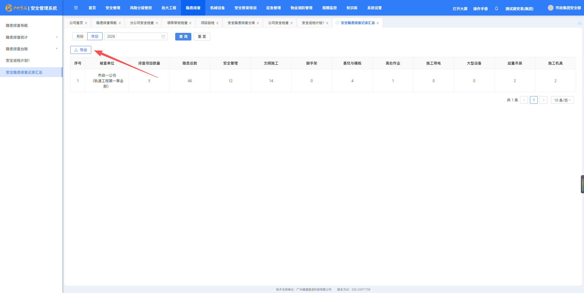 安全隐患排查记录汇总,可通过年月筛选,导出excel表格。