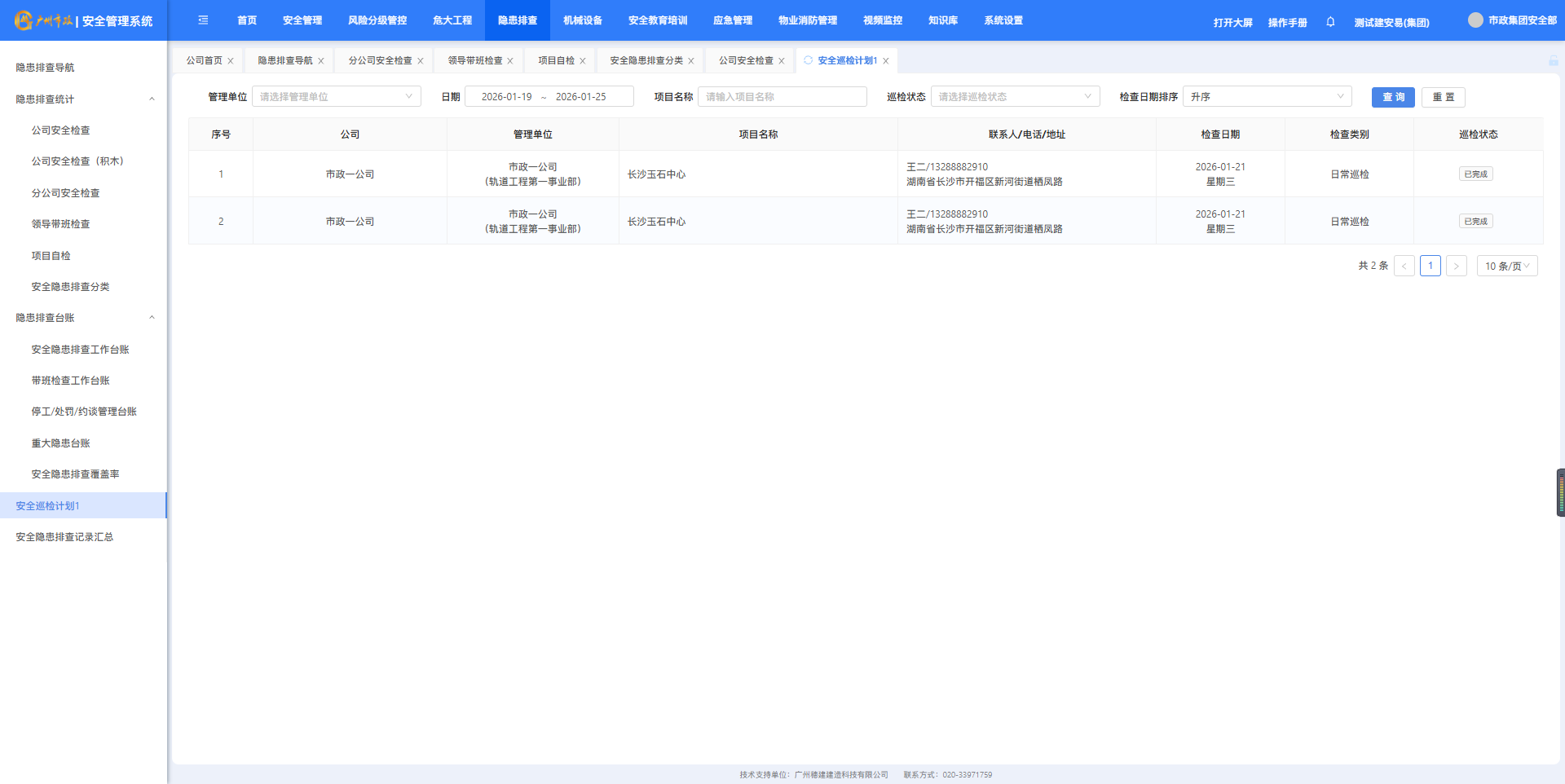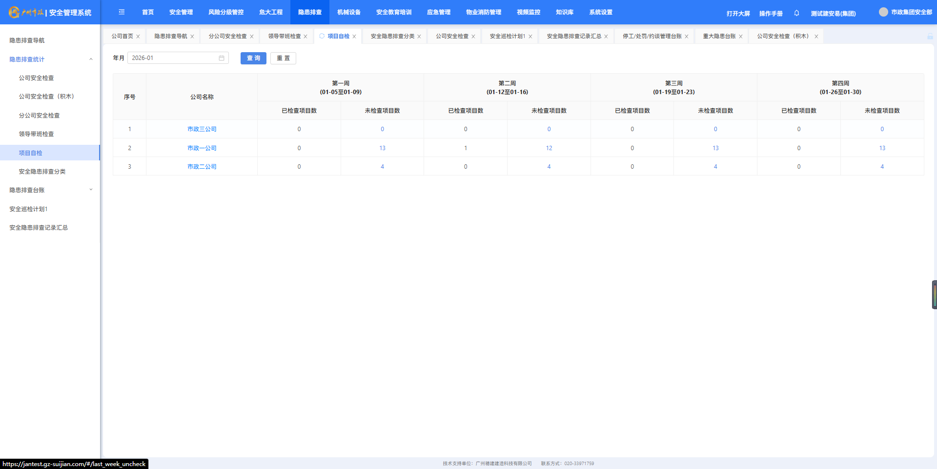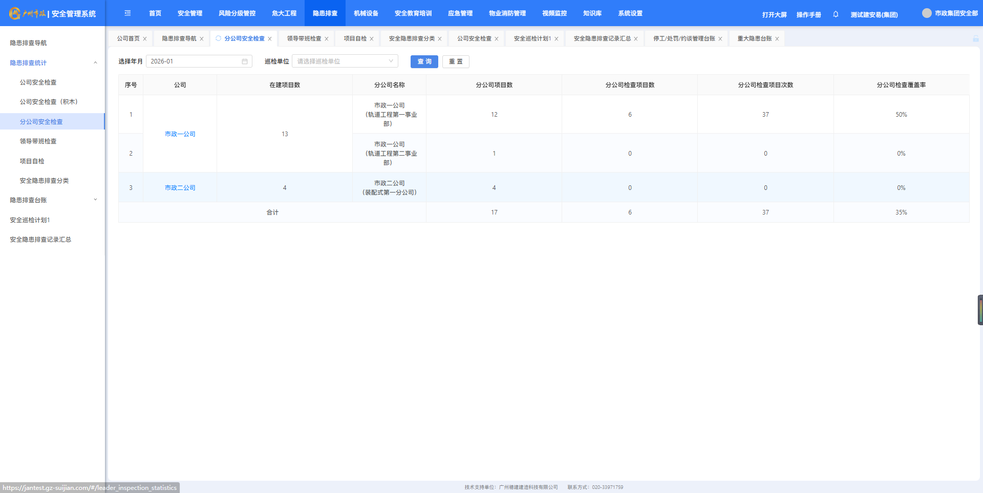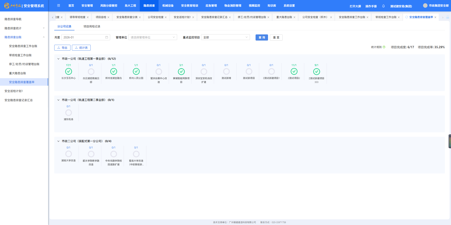 安全隐患排查覆盖率页面,可查询各分公司的安全检查以及项目自检的覆盖率。