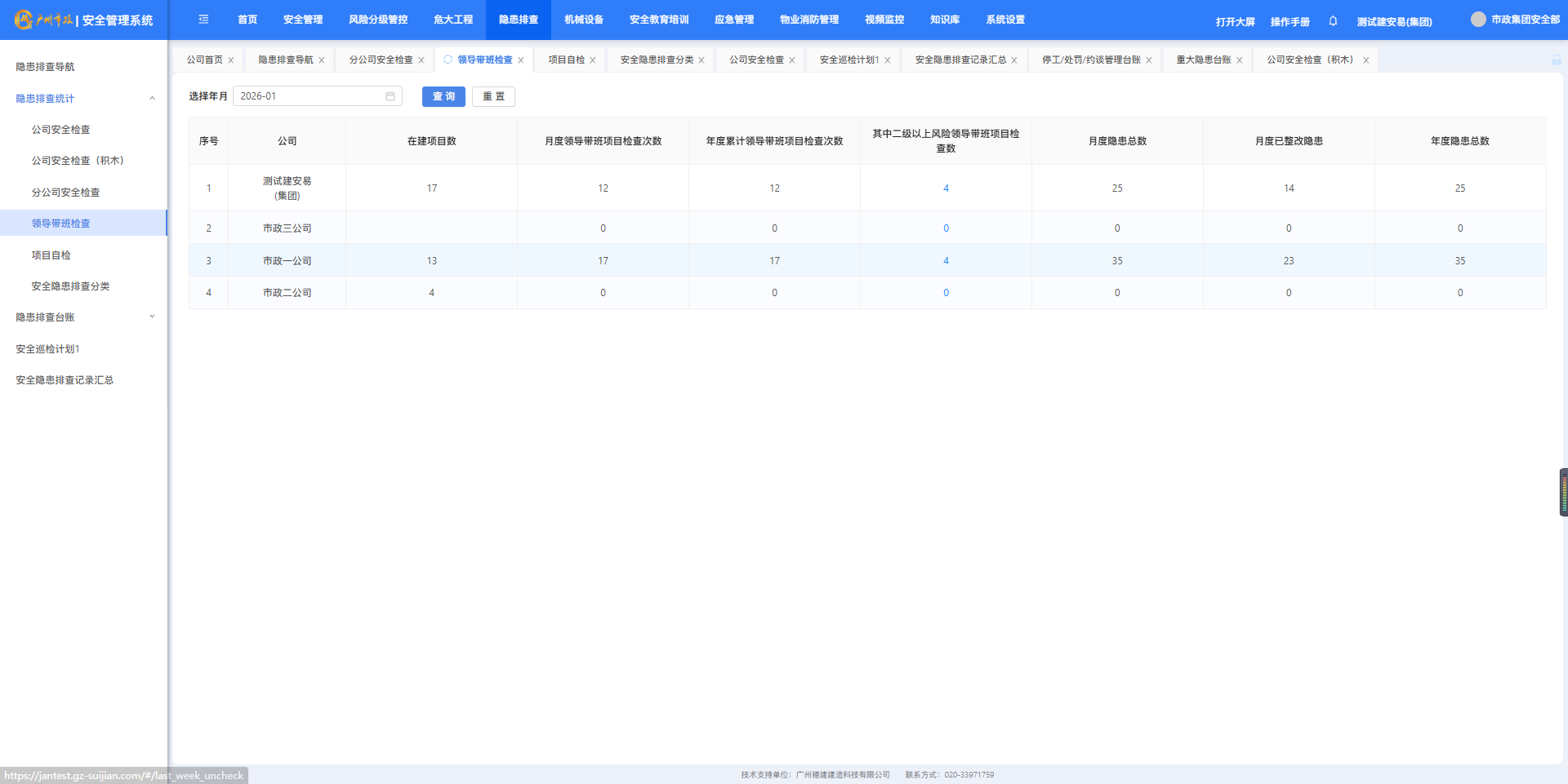 该页面展示集团以及公司领导带班的月度检查数据统计