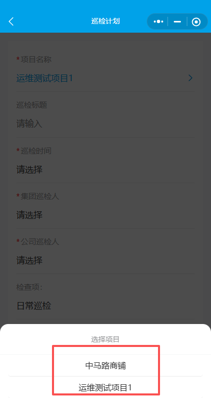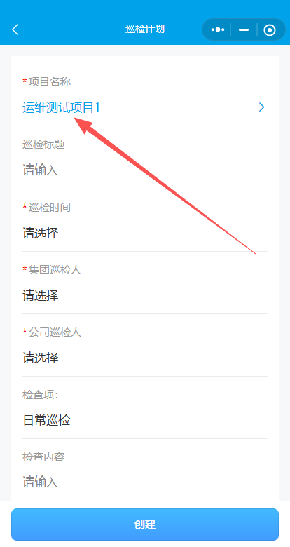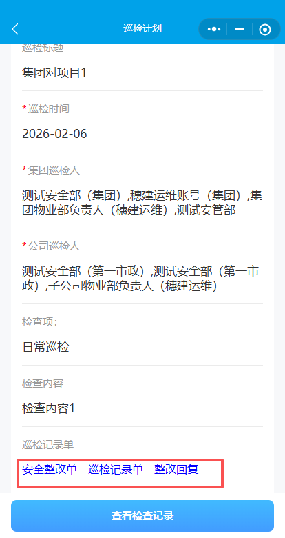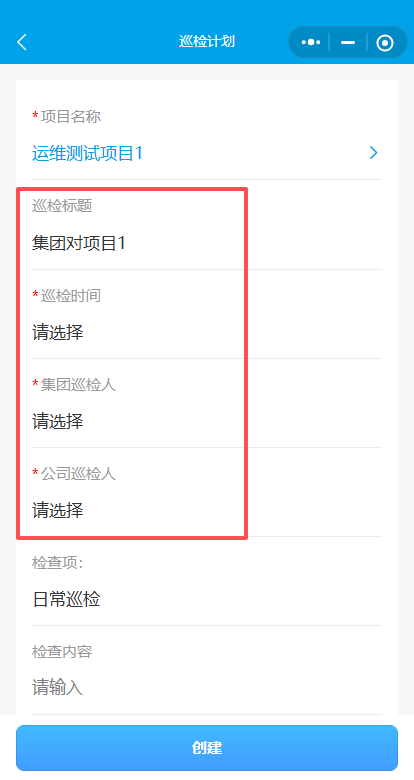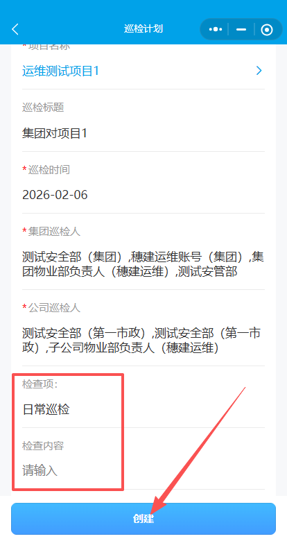 4.输入检查标题,选择检查时间集团、公司巡检人(集团、公司巡检人都要选上物业部和安管部的人)。