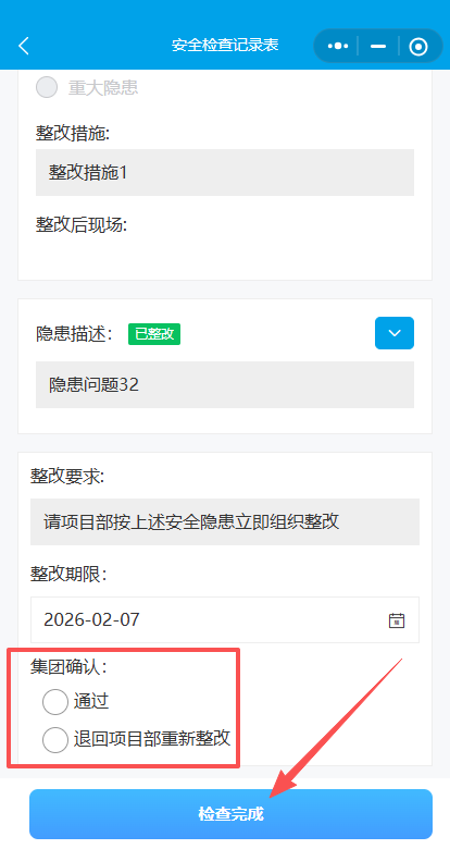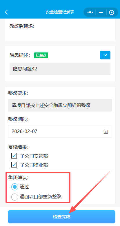 (共三种复核结果:1.项目已完成整改、2.整改不合格(流程结束生成整改文件)、3.退回项目重新整改)