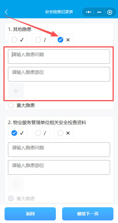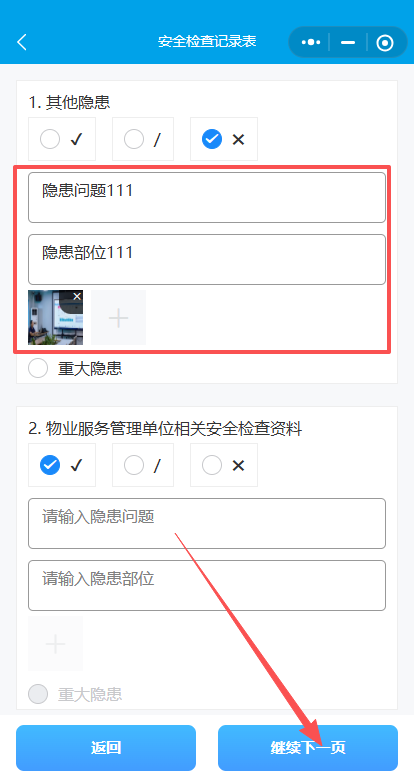 如果需要修改或新增隐患,点击“返回上一页”,找到修改或新增项,填写隐患问题、隐患部位上传照片附件点击“继续下一页”。