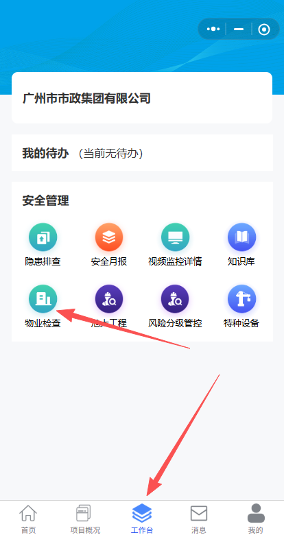 1.集团安管部点击工作台的物业检查。